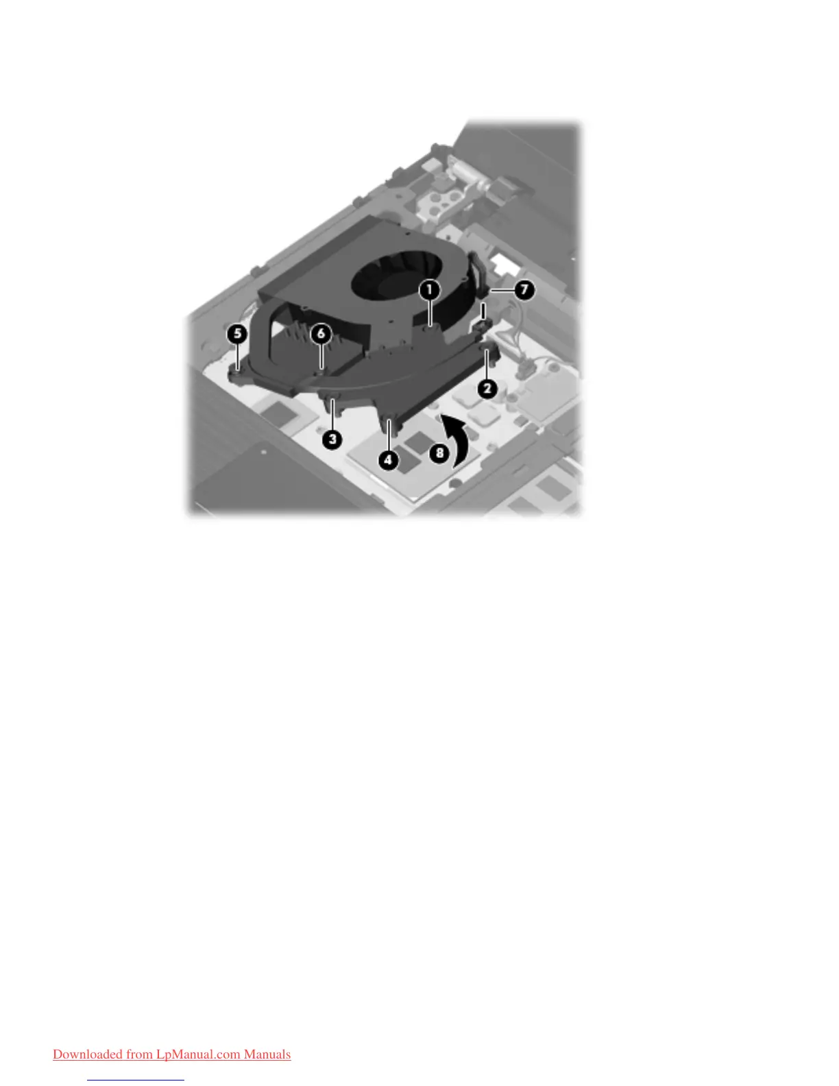 Disconnect the fan cable from the system board (7), and then remove the heat sink (8).