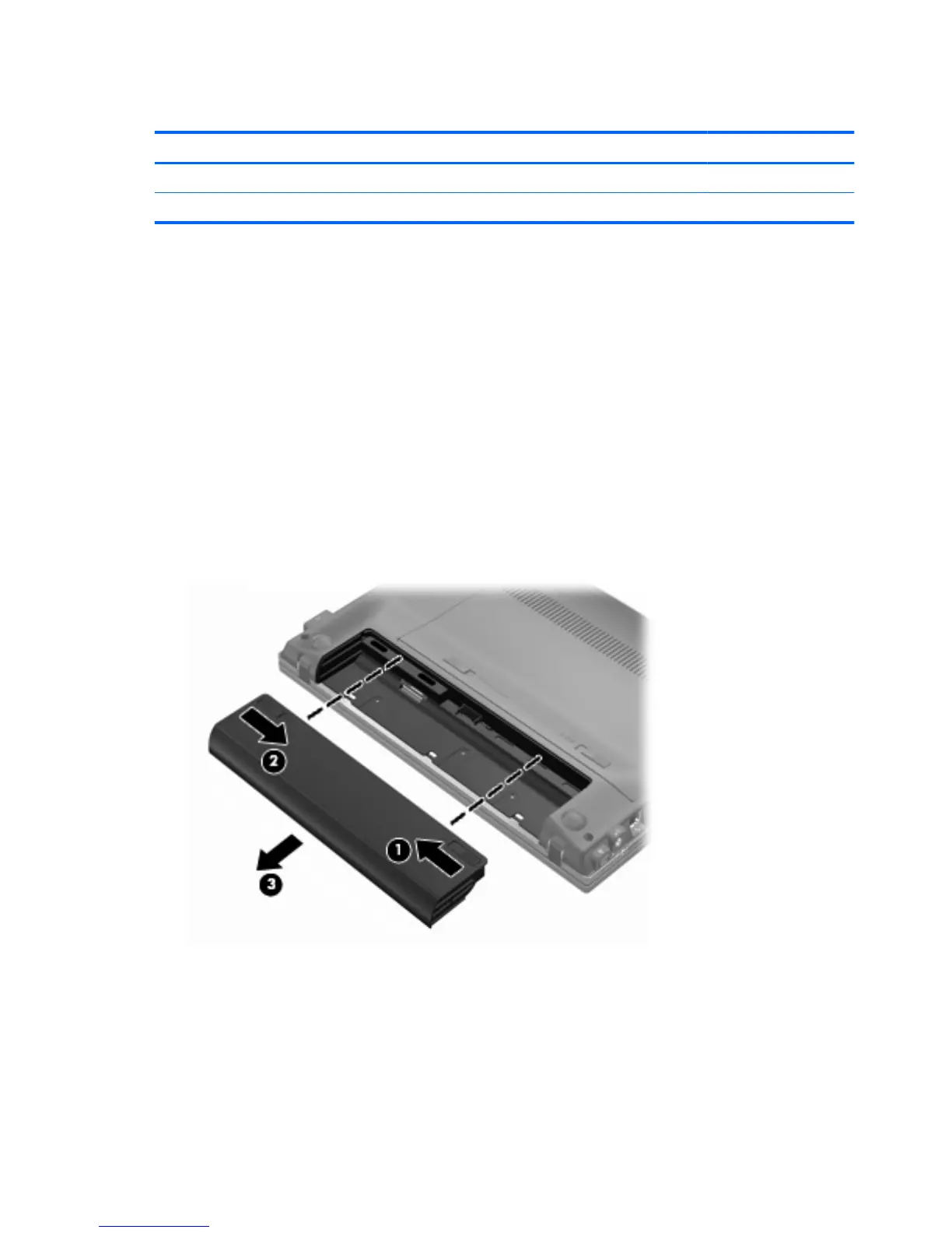 3. Slide the left release latch (2) inward and hold it in place as you slide and remove the battery (3).