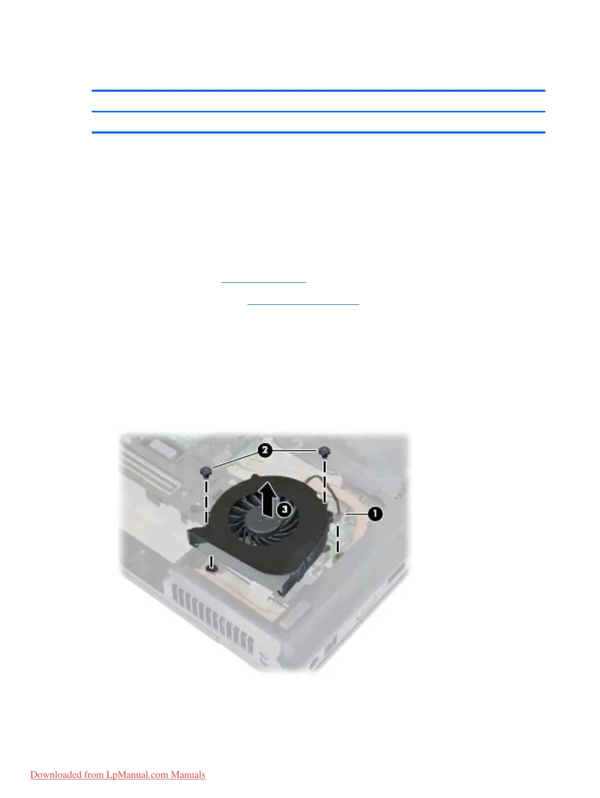 3. Remove the two Phillips PM 2.5x5.0 screws (2) that secure the fan to the base enclosure.