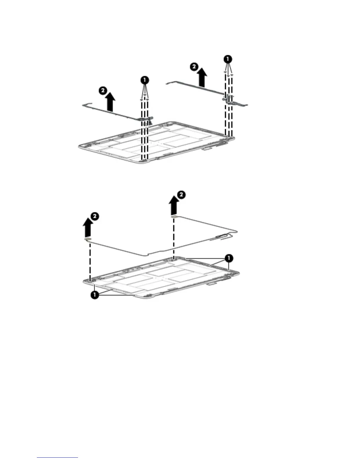 6. If it is necessary to replace the WLAN antenna cables, remove the 3 screws from each side (1), and then