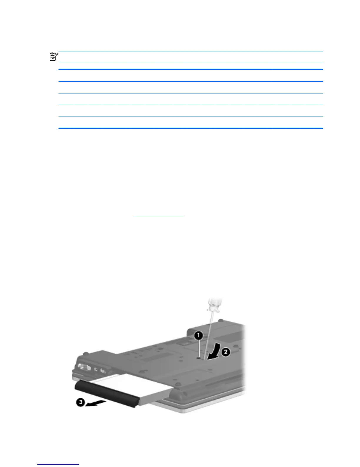3. Insert a flat-bladed screwdriver or similar tool into the optical drive tab access (2) and press the