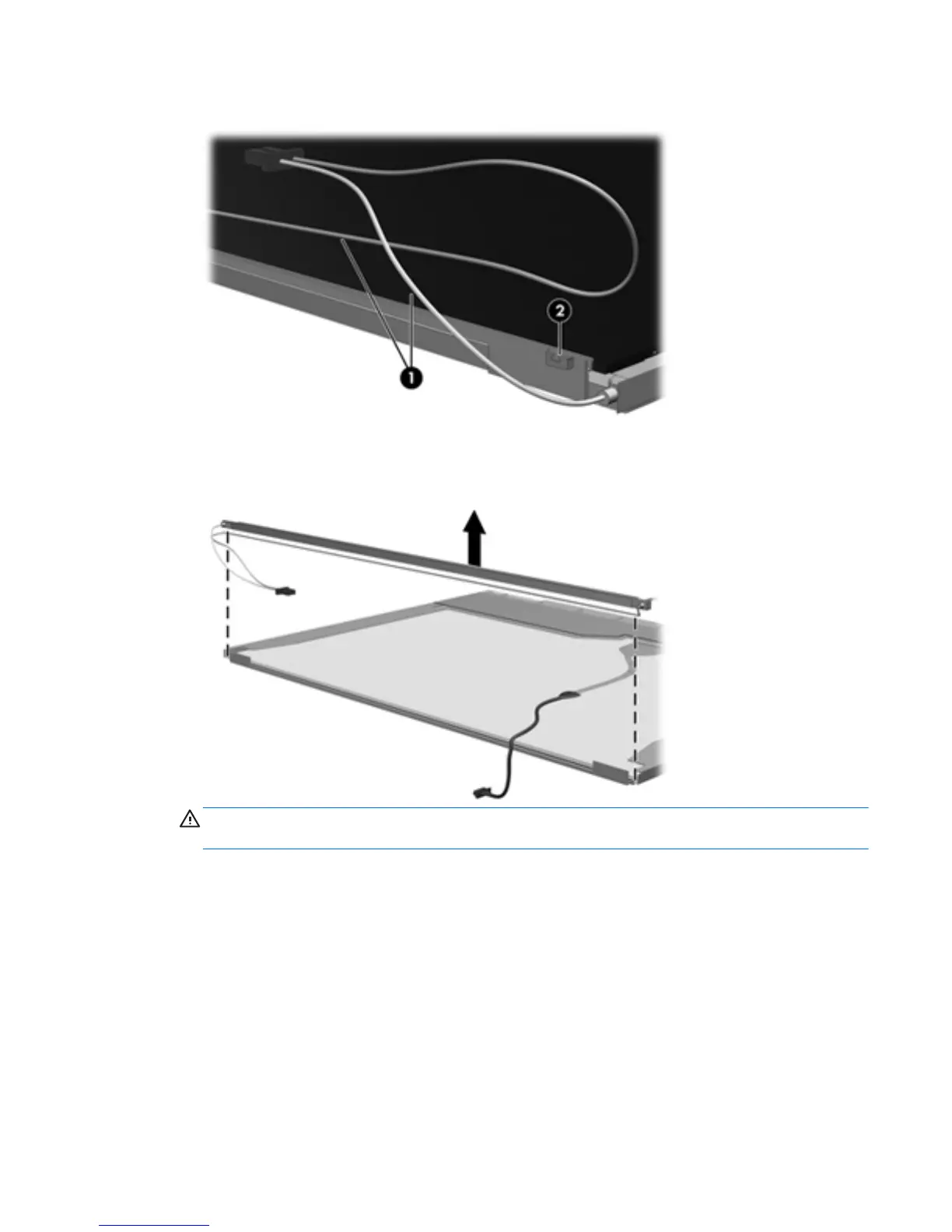 Remove the backlight cables (1) from the clip (2) in the display panel.