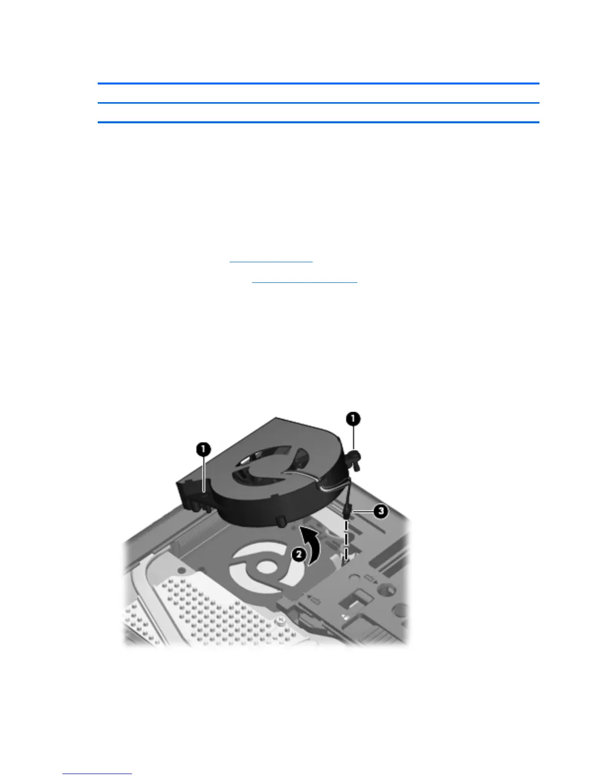 3. Rotate the right side of the fan upward at an angle (2), and then lift the fan up to gain access to