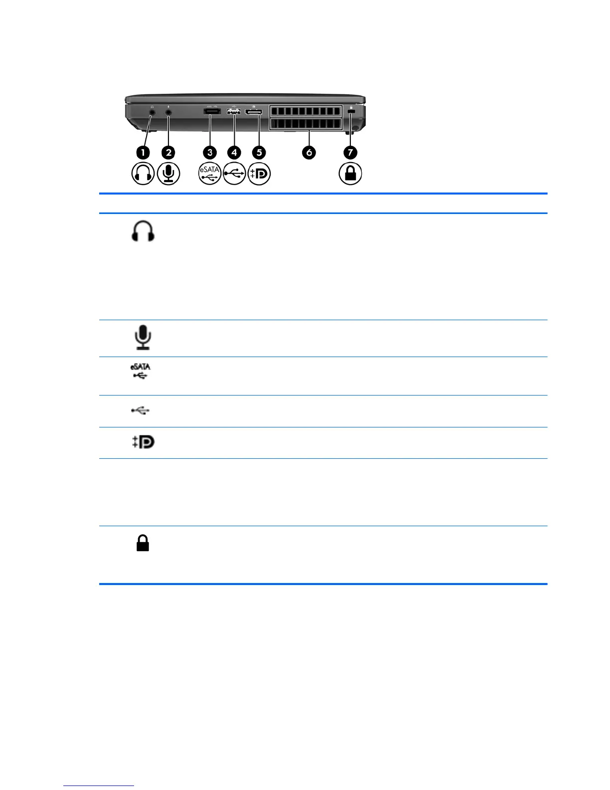 eSATA/USB 2.0 combo port Connects a high-performance eSATA component, such as