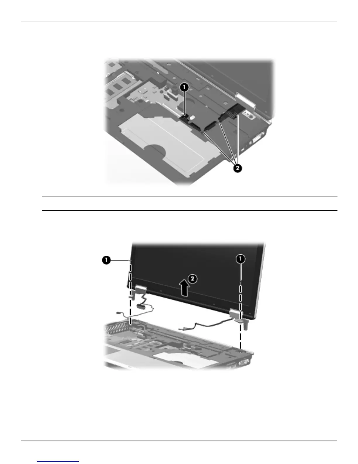 10. Remove the wireless antenna cables from the clips 2 and routing channel built into the top cover.