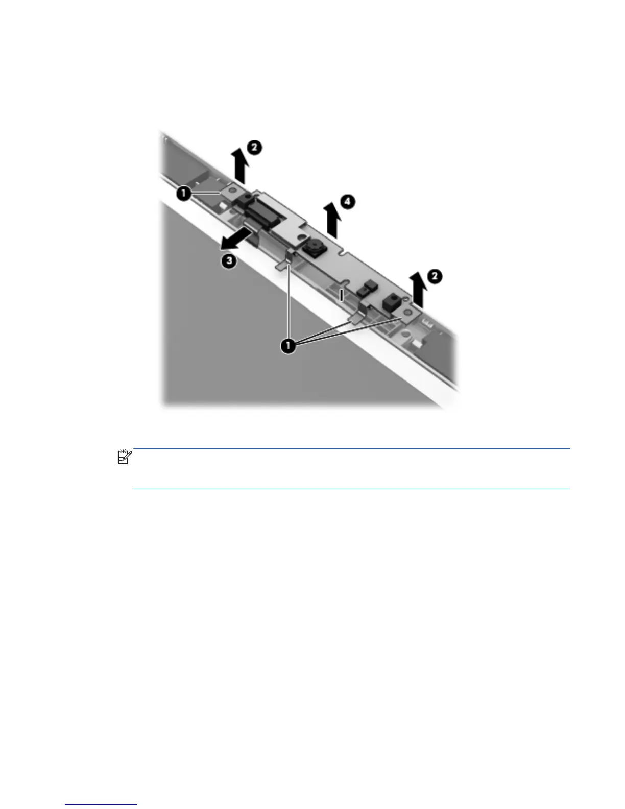 Remove the webcam/microphone module (4). The webcam/microphone module is available