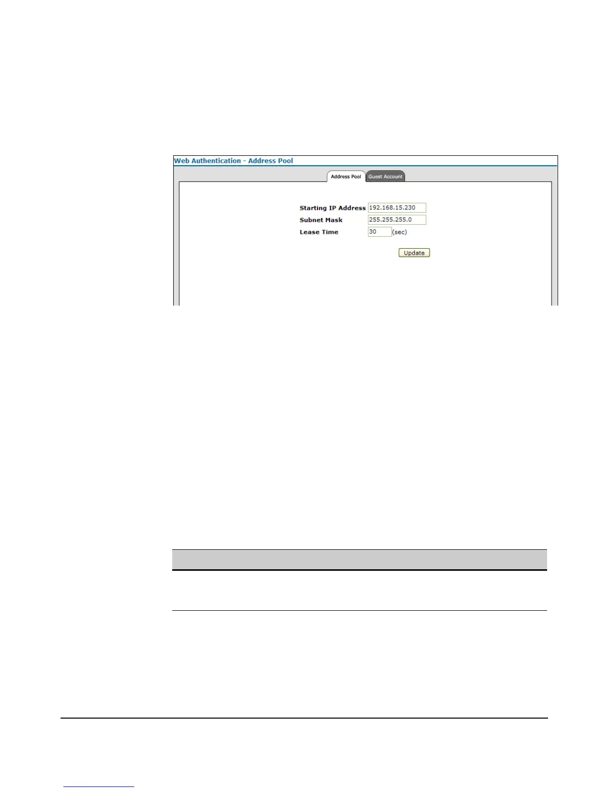 ■ Lease Time: Specifies the lease, in seconds, granted to Web-Auth tempo-