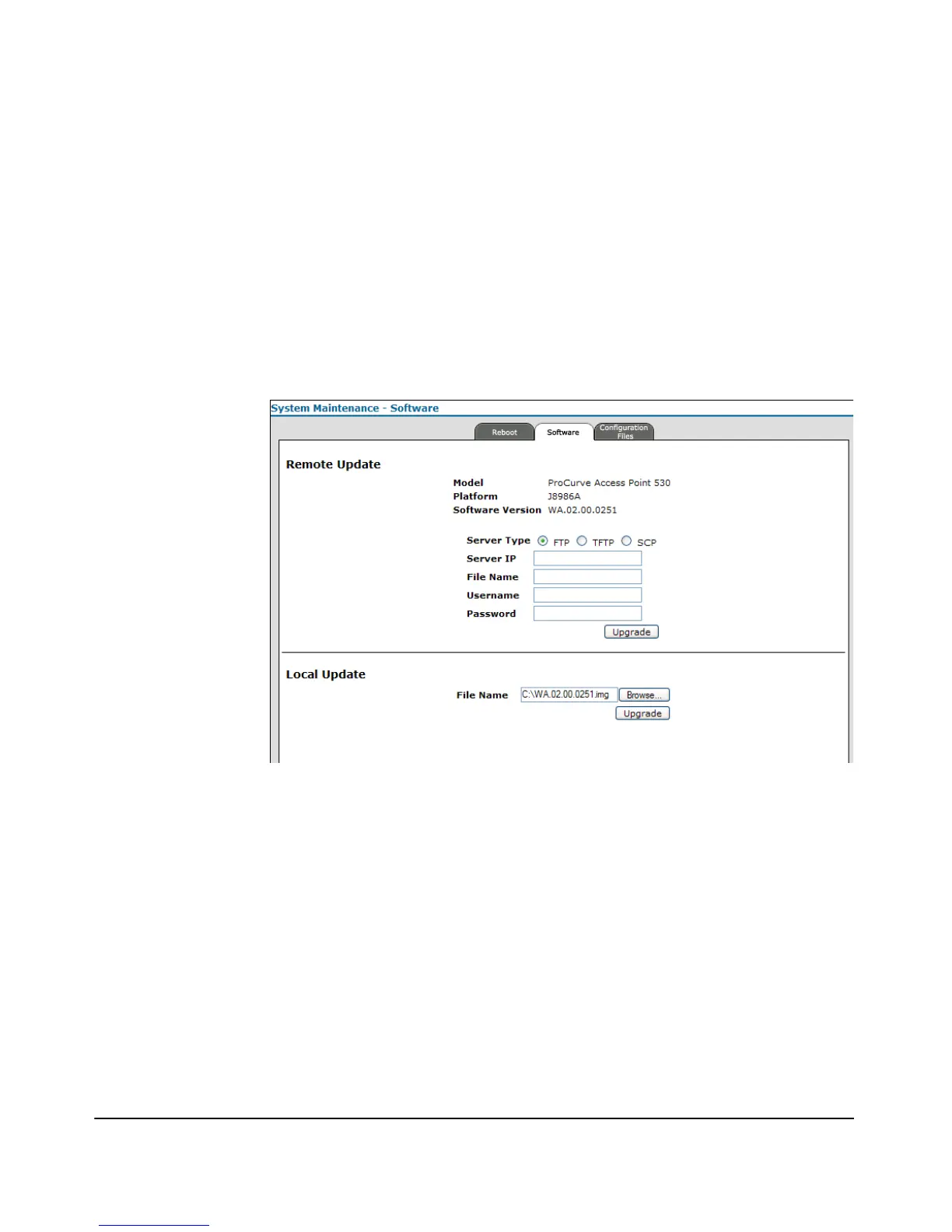 • [Browse]: Performs local system search for upgrade file.