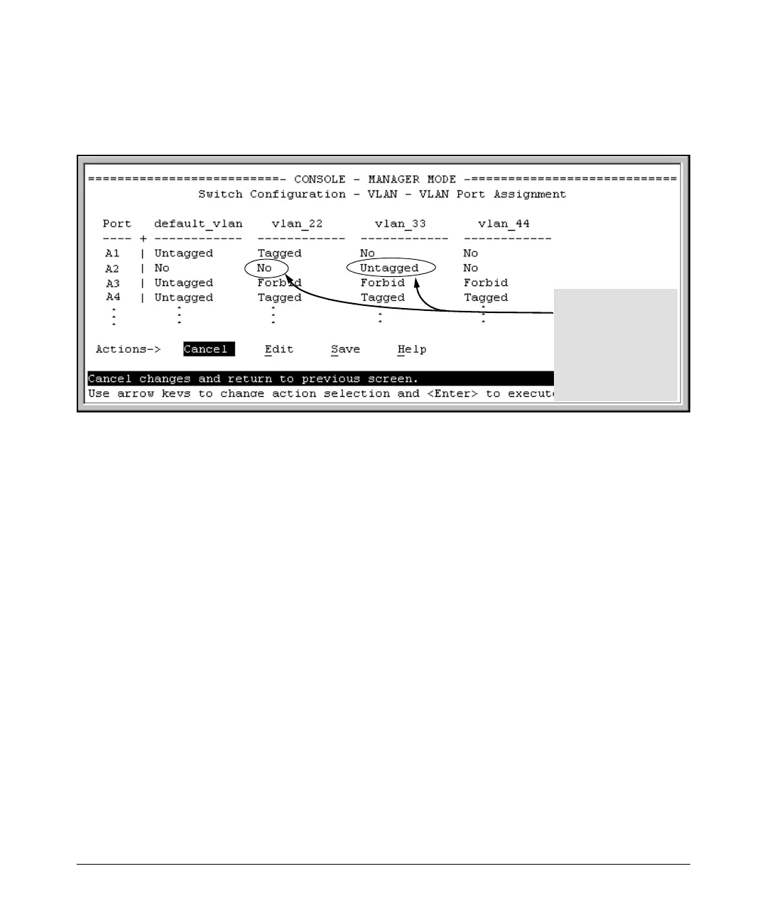 ■ VLAN 33 becomes unavailable to port A2 for the duration of the session