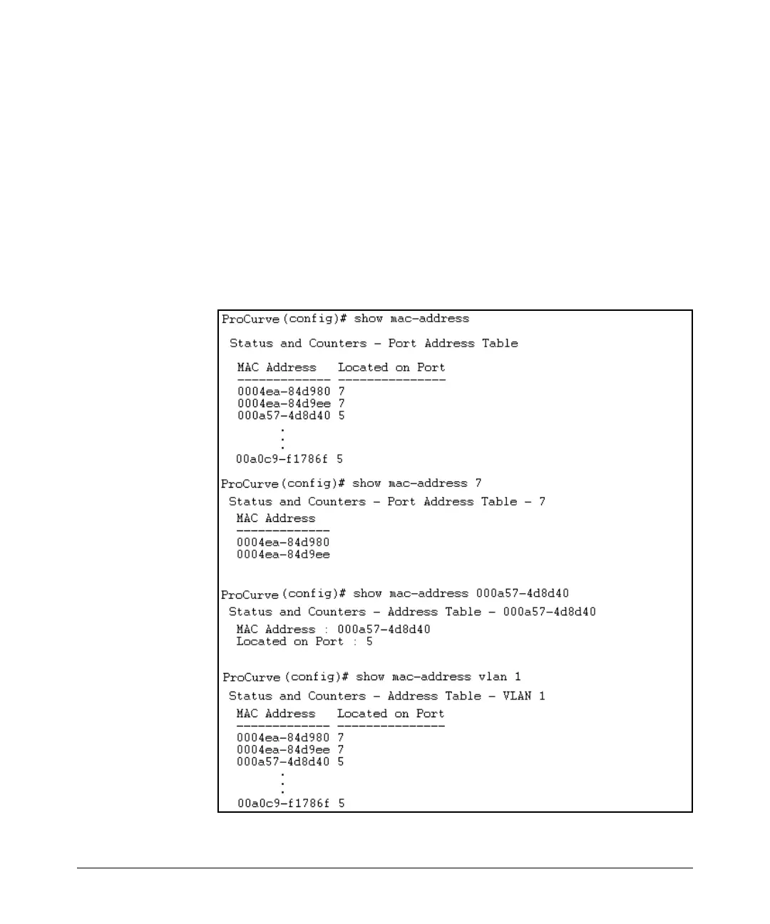 Syntax: show mac-address [ port-list | mac-address | vlan < vid >]