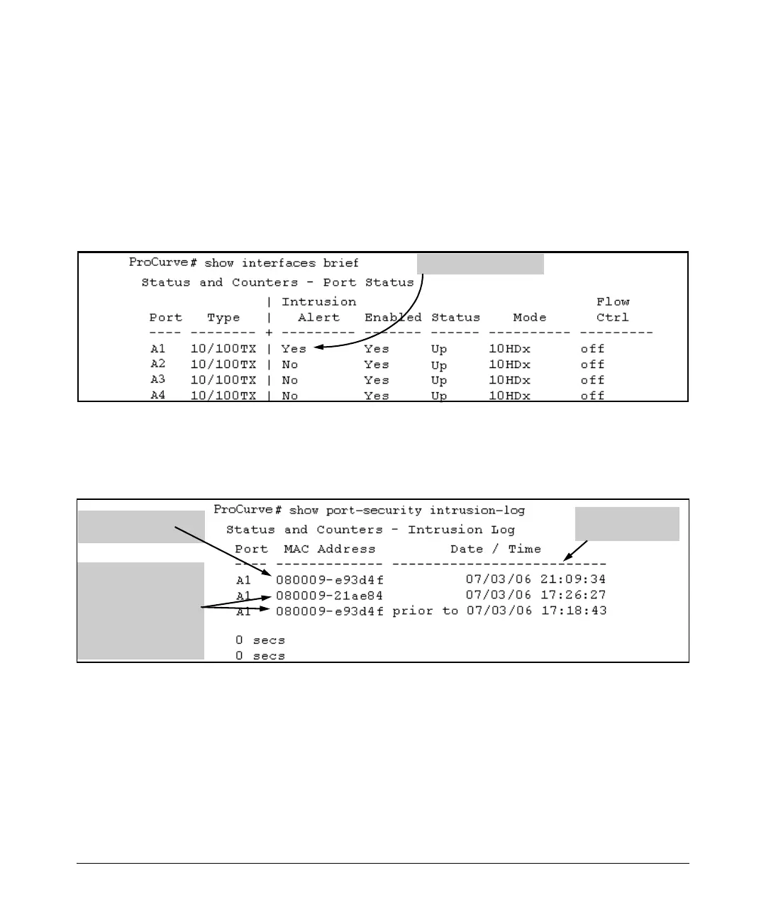 the port-security < port-list > clear-intrusion-flag command. (The intrusion log