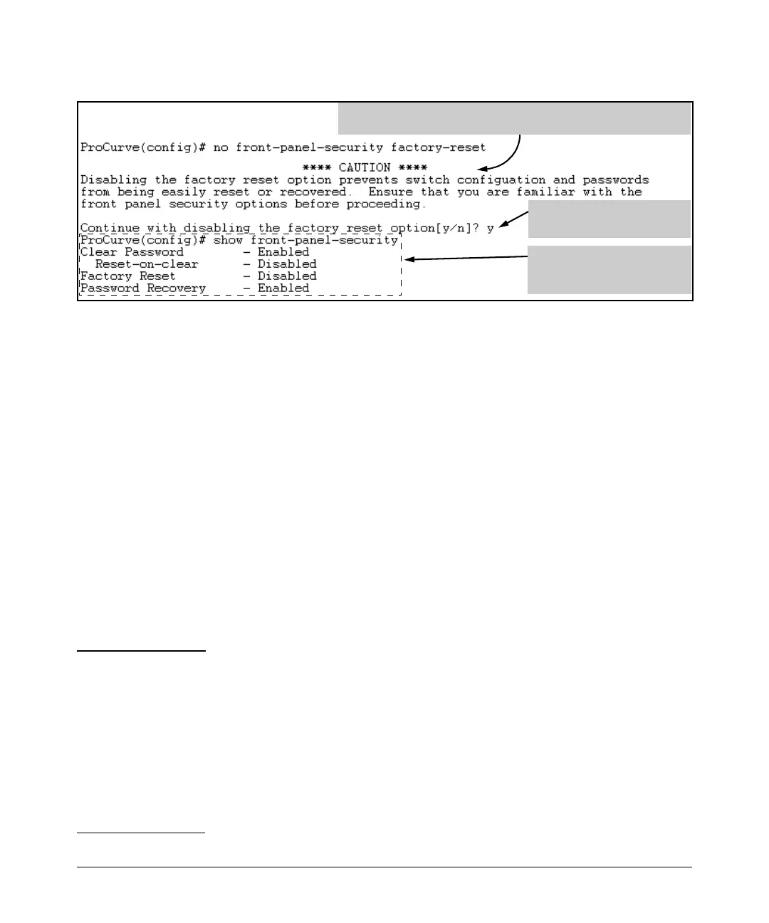 The command to disable the factory-reset operation produces this caution.