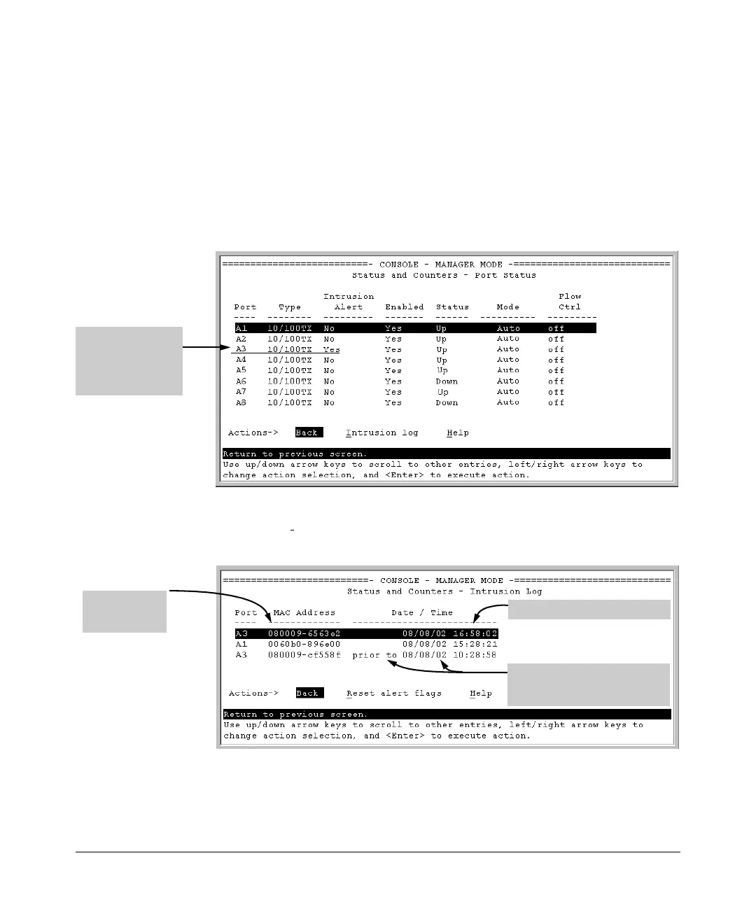The menu interface indicates per-port intrusions in the Port Status screen, and
