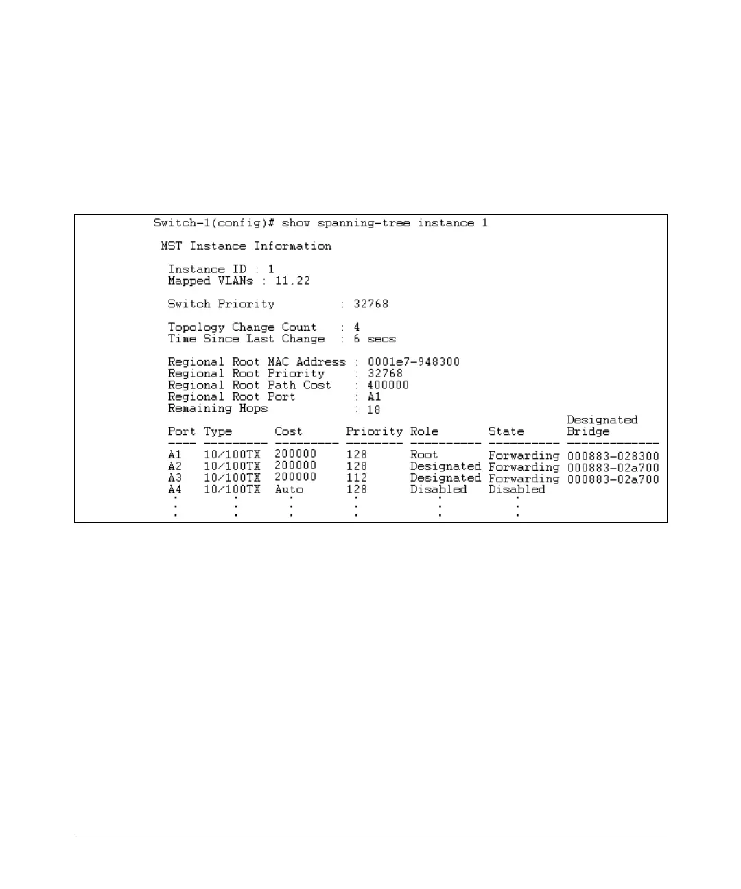 Figure 5-12. Example of MSTP Statistics for a Specific Instance on an MSTP Switch