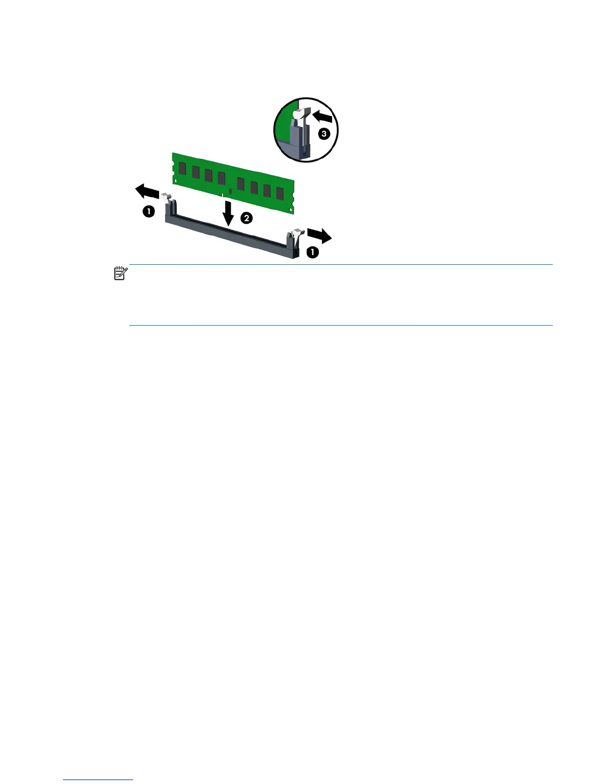 4. Open both latches of the memory module socket (1), and insert the memory module into the