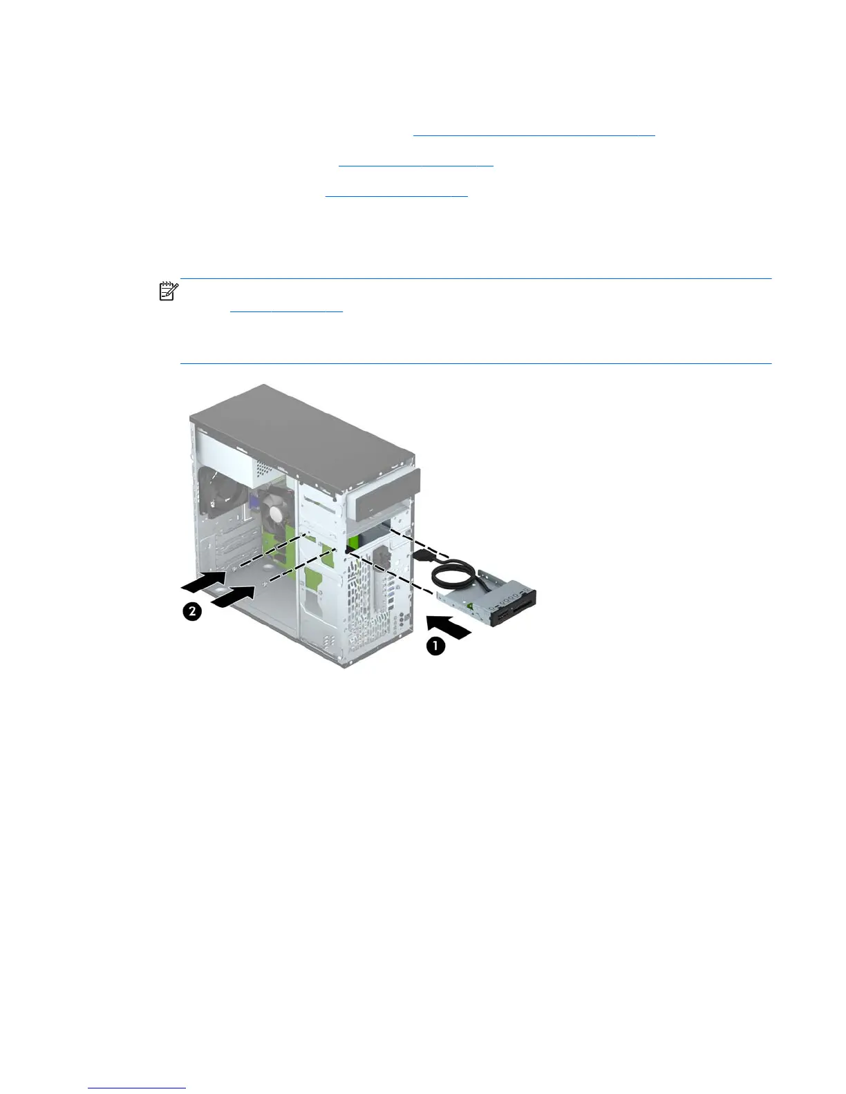 4. Slide the device into the drive bay (1) and install the two 6-32 mounting screws in the side of the