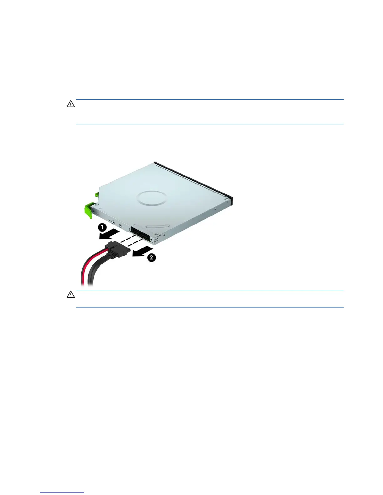 6. Disconnect the power cable (1) and data cable (2) from the rear of the optical drive.