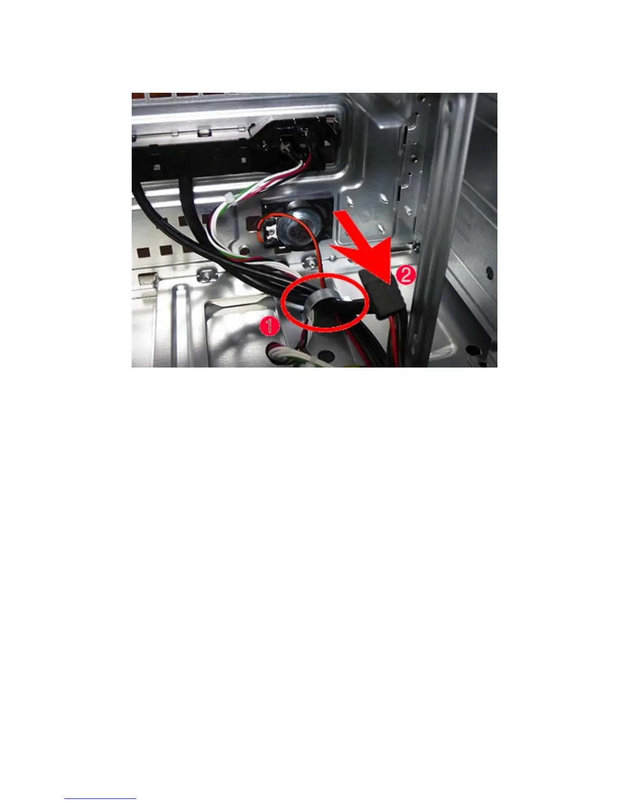 5. Under the drive cage, remove the speaker cable from the clip built into the base of the chassis (1), and