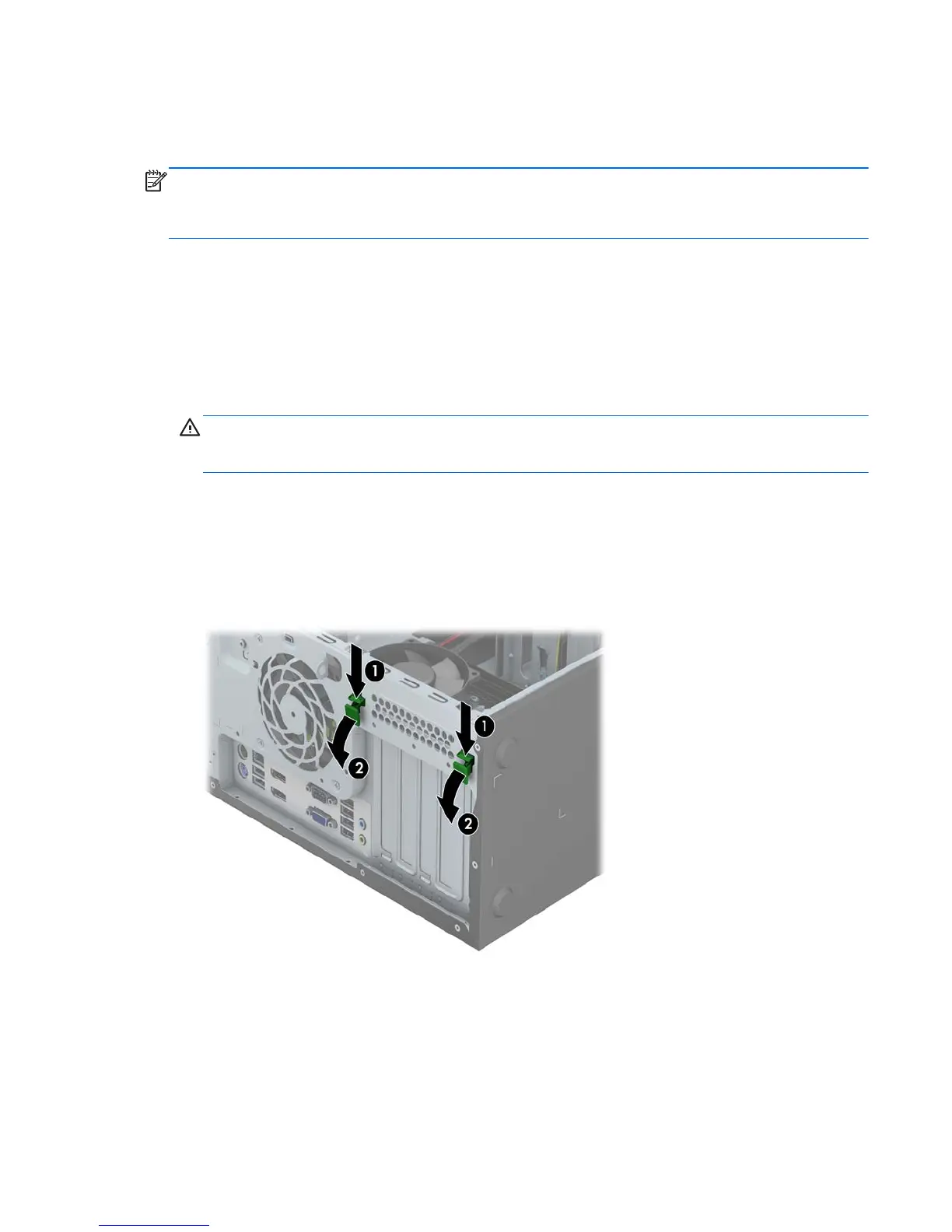 7. Press straight down on the two green thumb tabs on the exterior of the chassis (1) and rotate the
