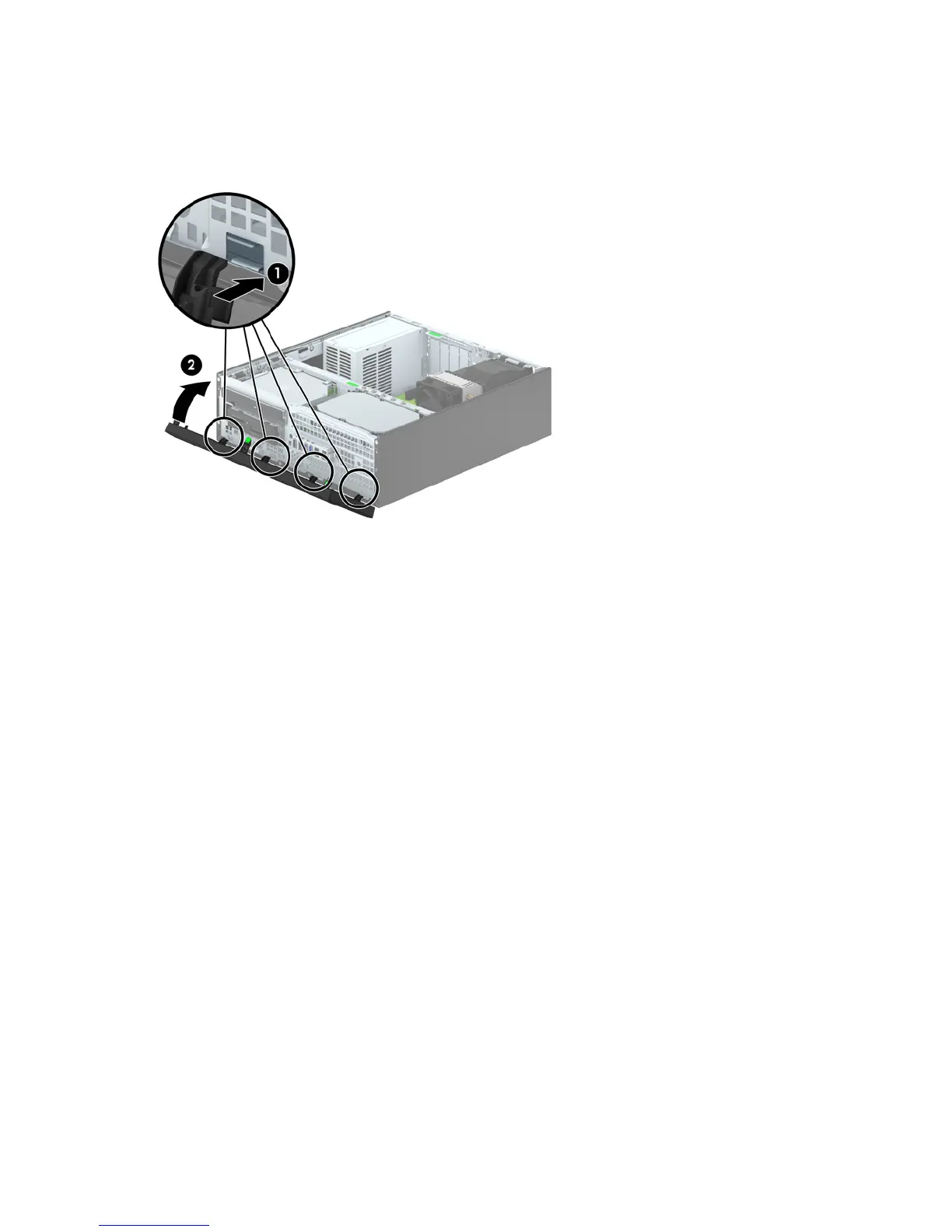 Insert the four hooks on the bottom side of the bezel into the rectangular holes on the chassis (1) then