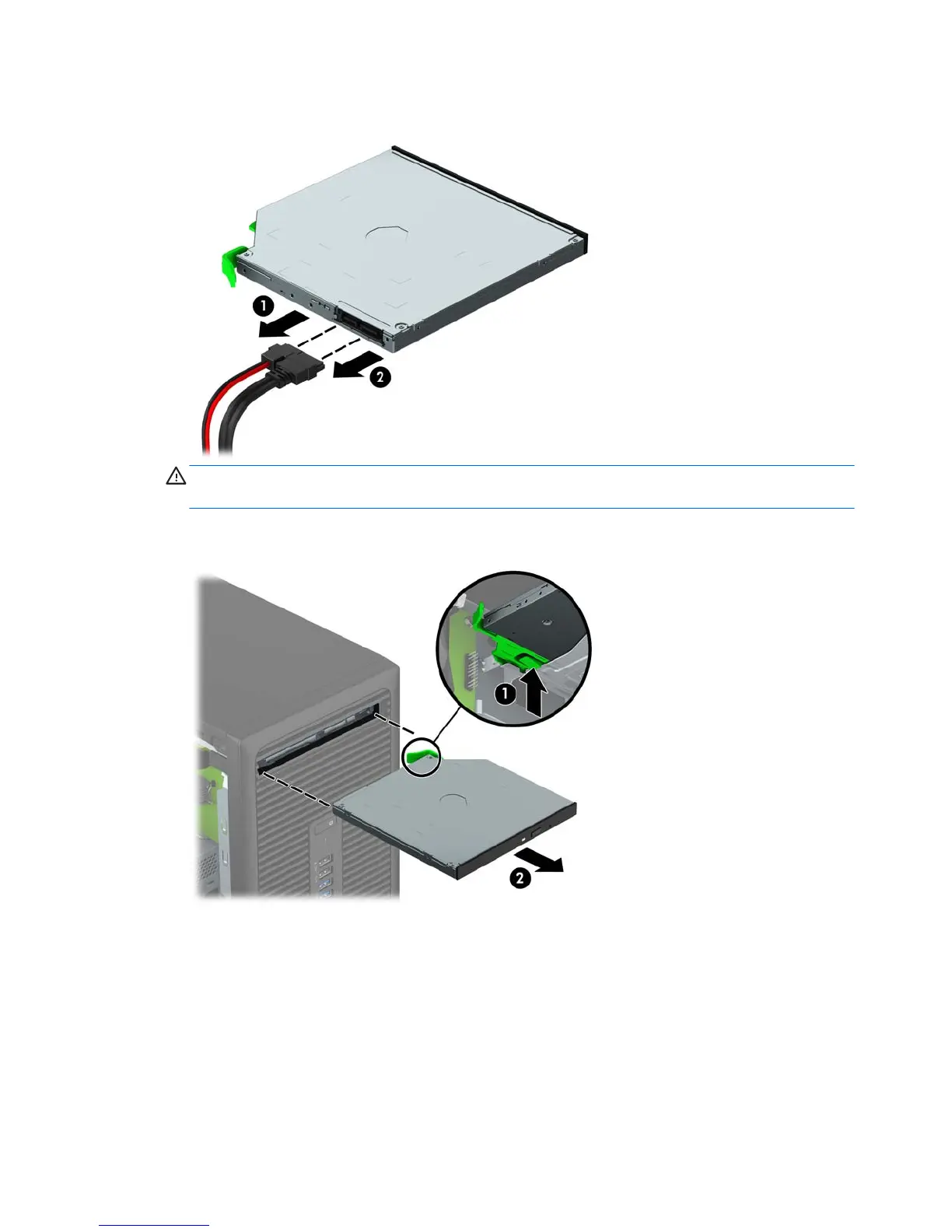 5. Disconnect the power cable (1) and data cable (2) from the rear of the optical drive.
