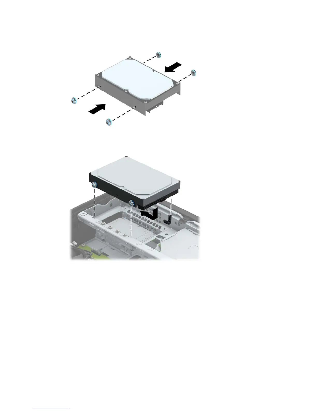 7. Align the mounting screws with the slots on the chassis drive cage, press the hard drive down into the