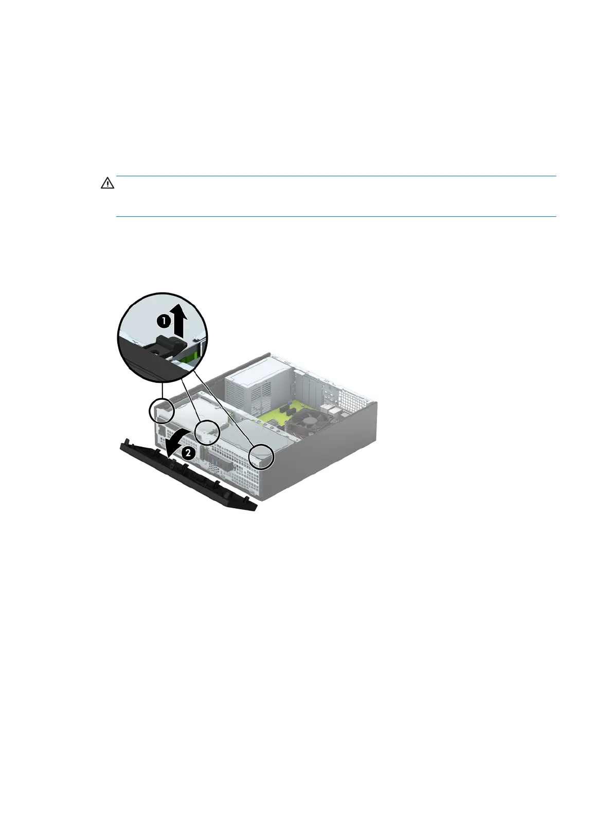 7. Lift up the three tabs on the side of the bezel (1), and then rotate the bezel off the chassis (2).