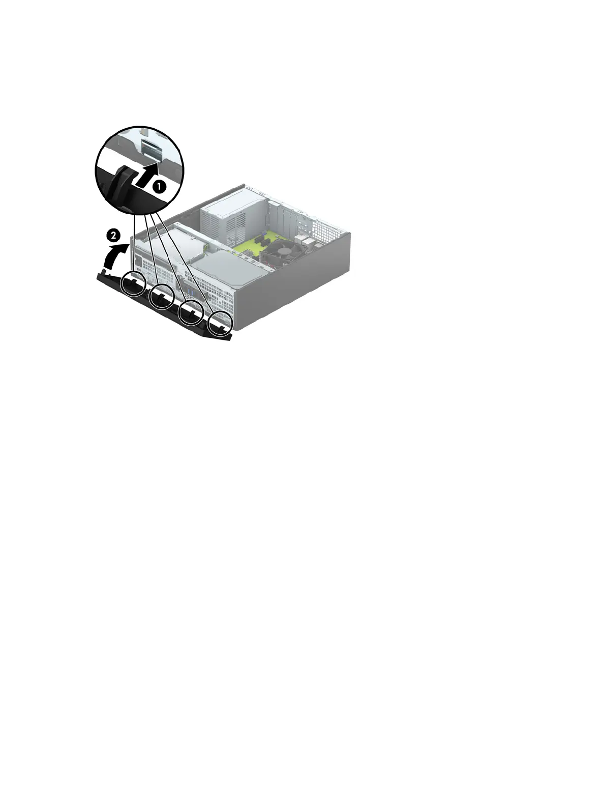 Insert the four hooks on the bottom side of the bezel into the rectangular holes on the chassis (1), and then