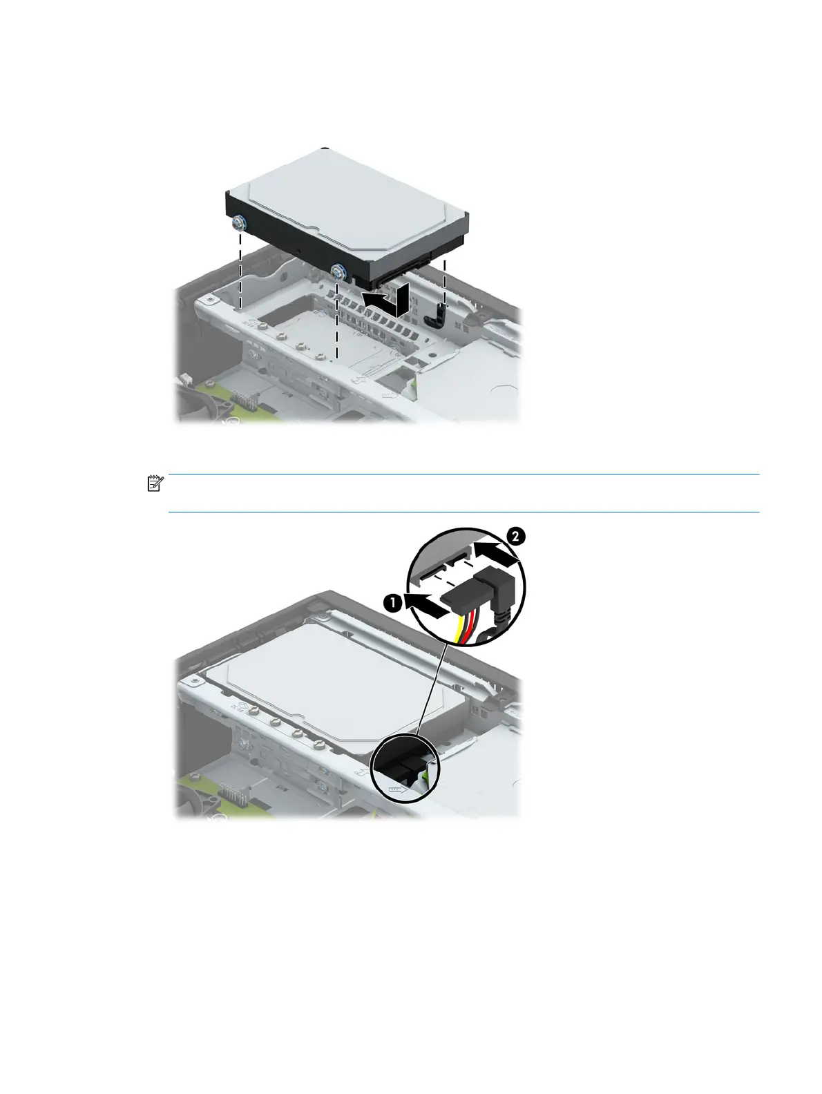 11. Connect the power cable (1) and data cable (2) to the back of the hard drive.