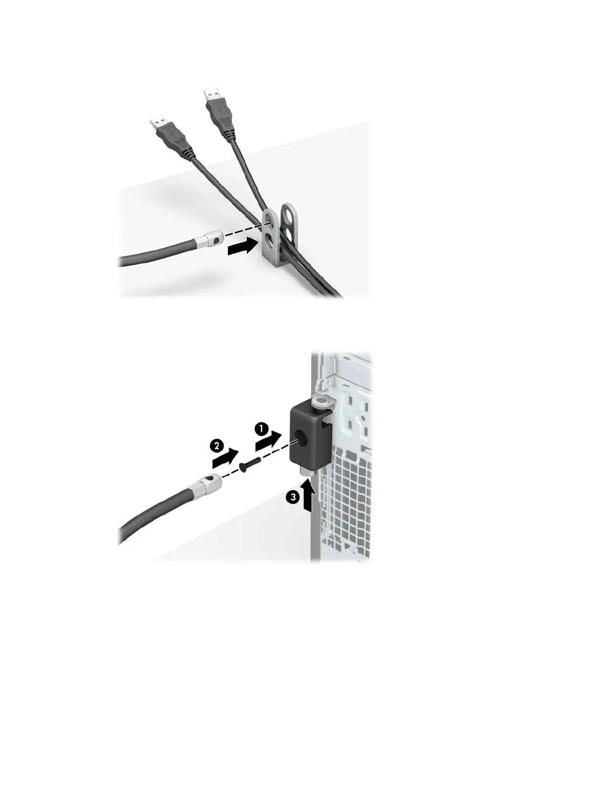 8. Screw the lock to the chassis using the screw provided (1). Insert the plug end of the security cable into