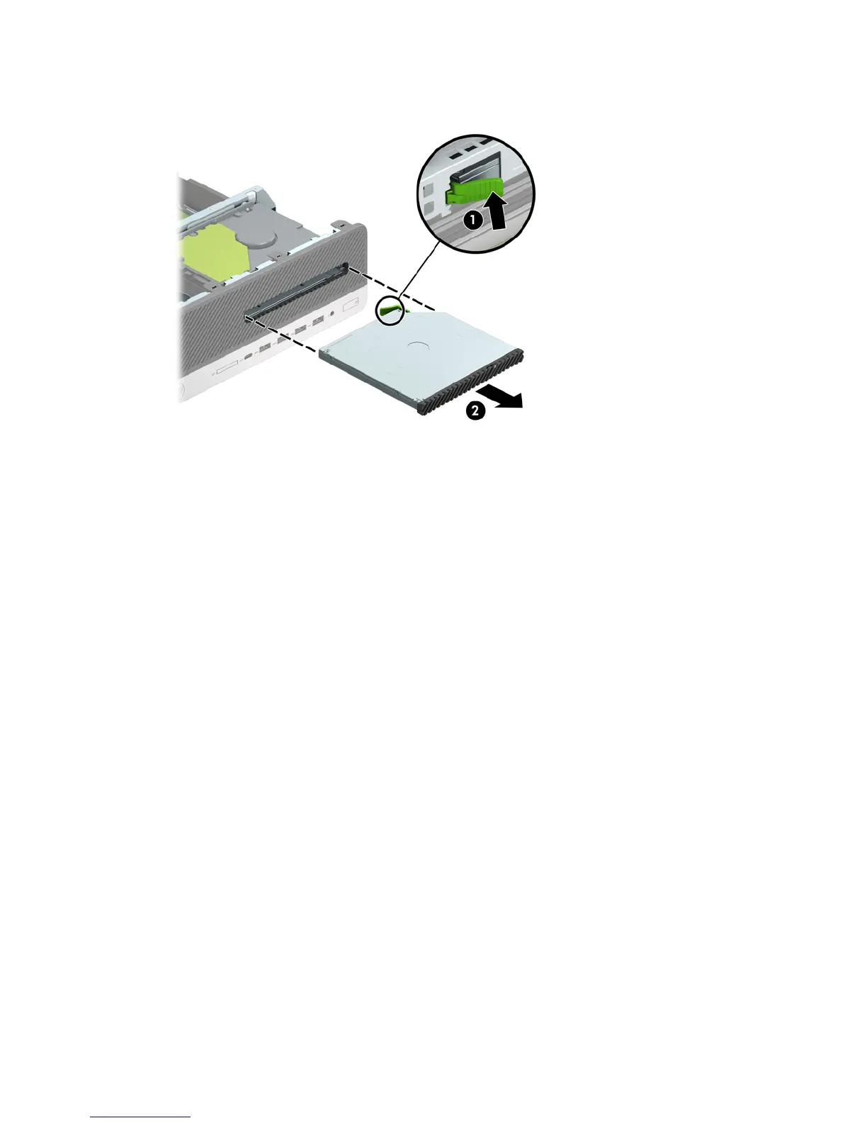 8. Push the green release latch on the right rear side of the drive toward the center of the drive (1), and