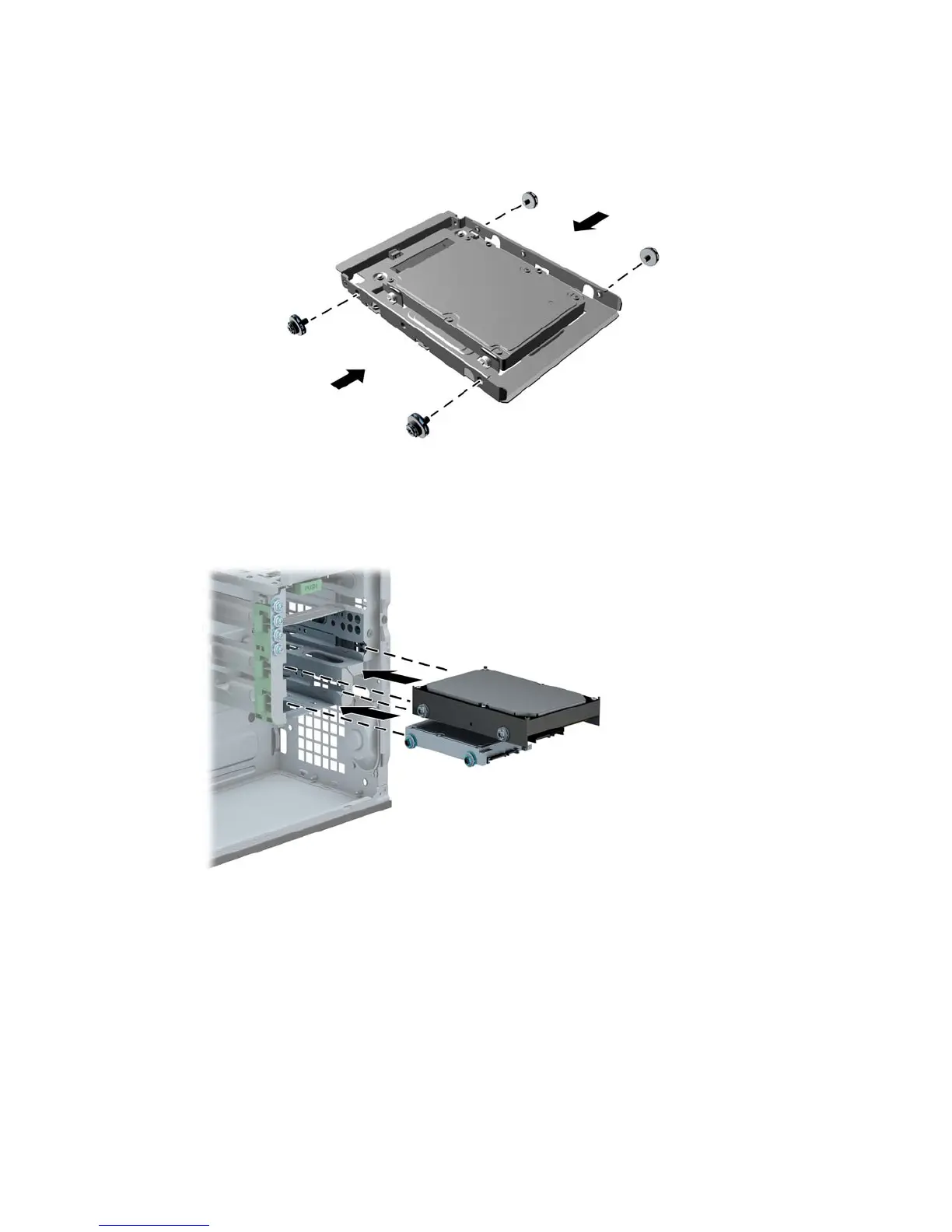 Install four 6-32 silver and blue isolation mounting guide screws in the adapter bracket