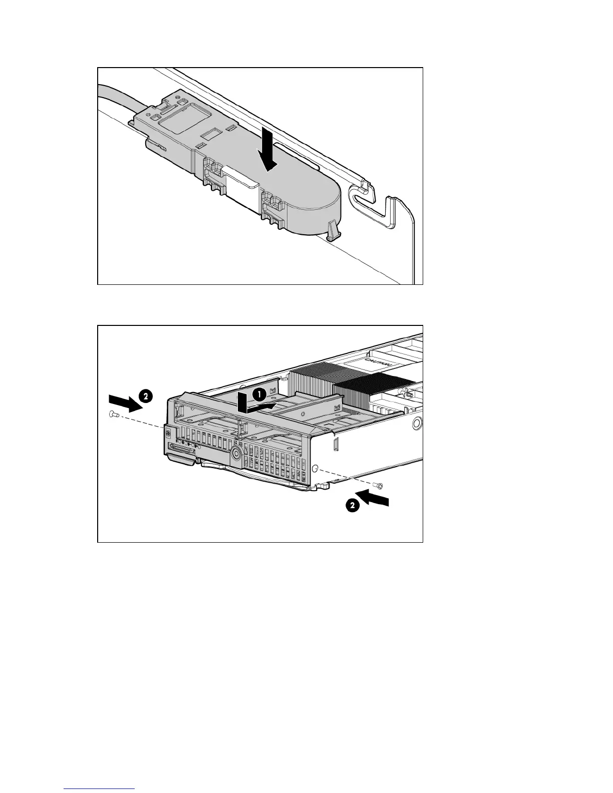 14. Install the two T-15 screws to secure the front panel/hard drive cage assembly to the chassis.