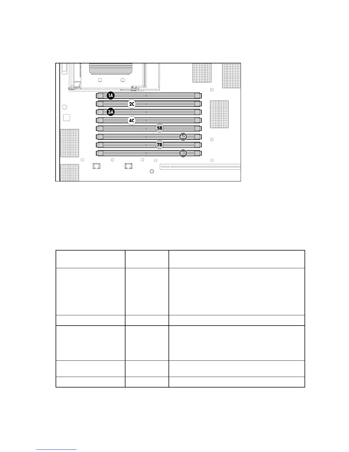 FBDIMM slots are numbered sequentially (1 through 8) and the paired banks are identified by the letters