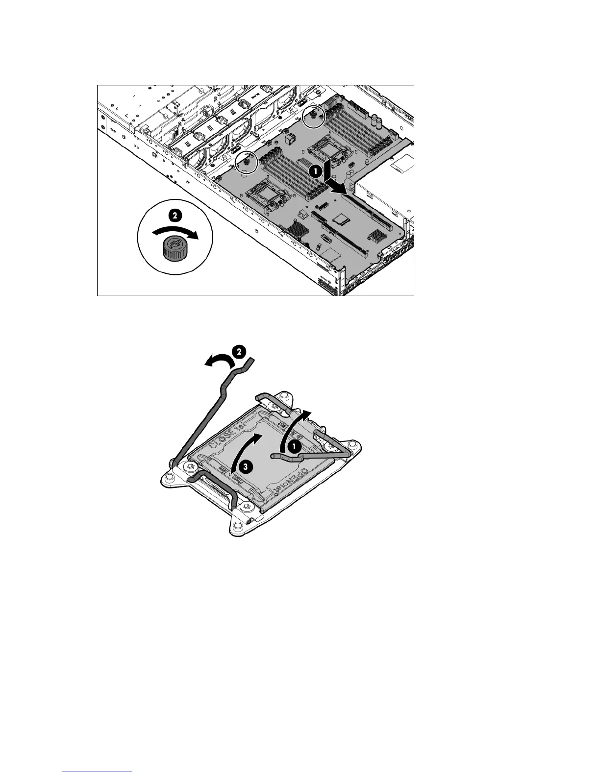 2. Open each of the processor locking levers in the order indicated, and then open the processor retaining