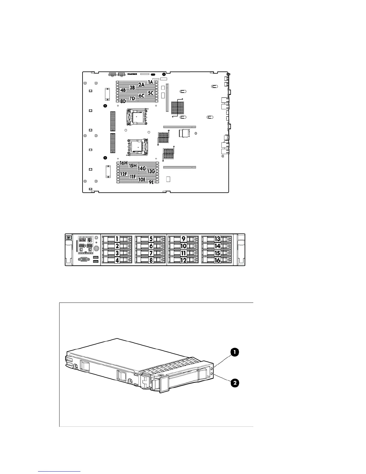 HP ProLiant DL385 G5p - DIMM Slots; Hard Drive Numbering; SAS and SATA Hard Drive Leds