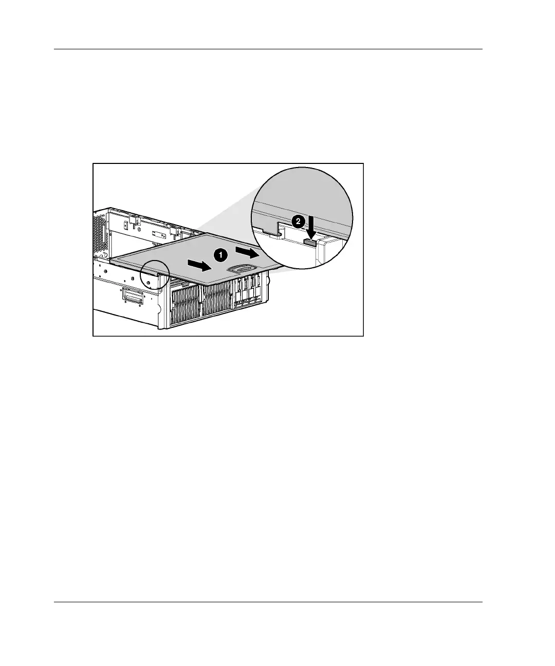 d. Push and hold the access panel release lever down (2) while sliding the rear