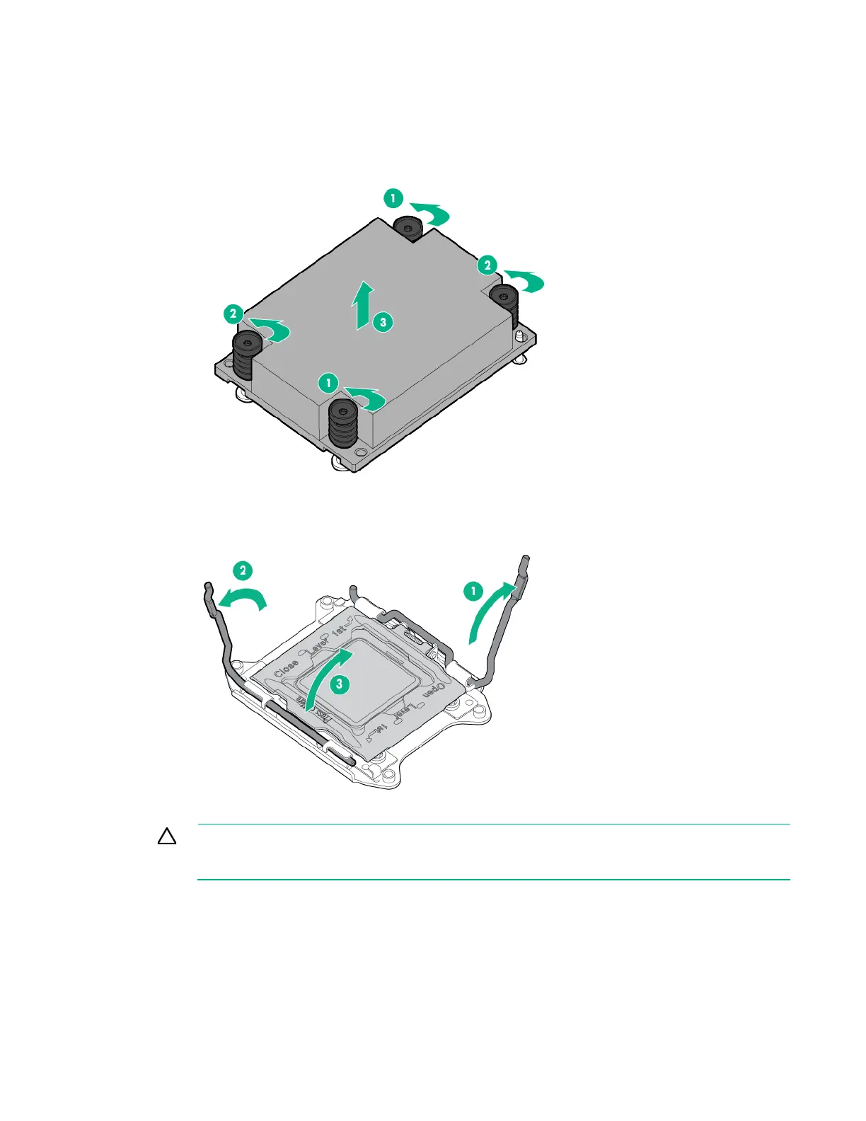 14. Open each of the processor locking levers in the order indicated, and then open the processor