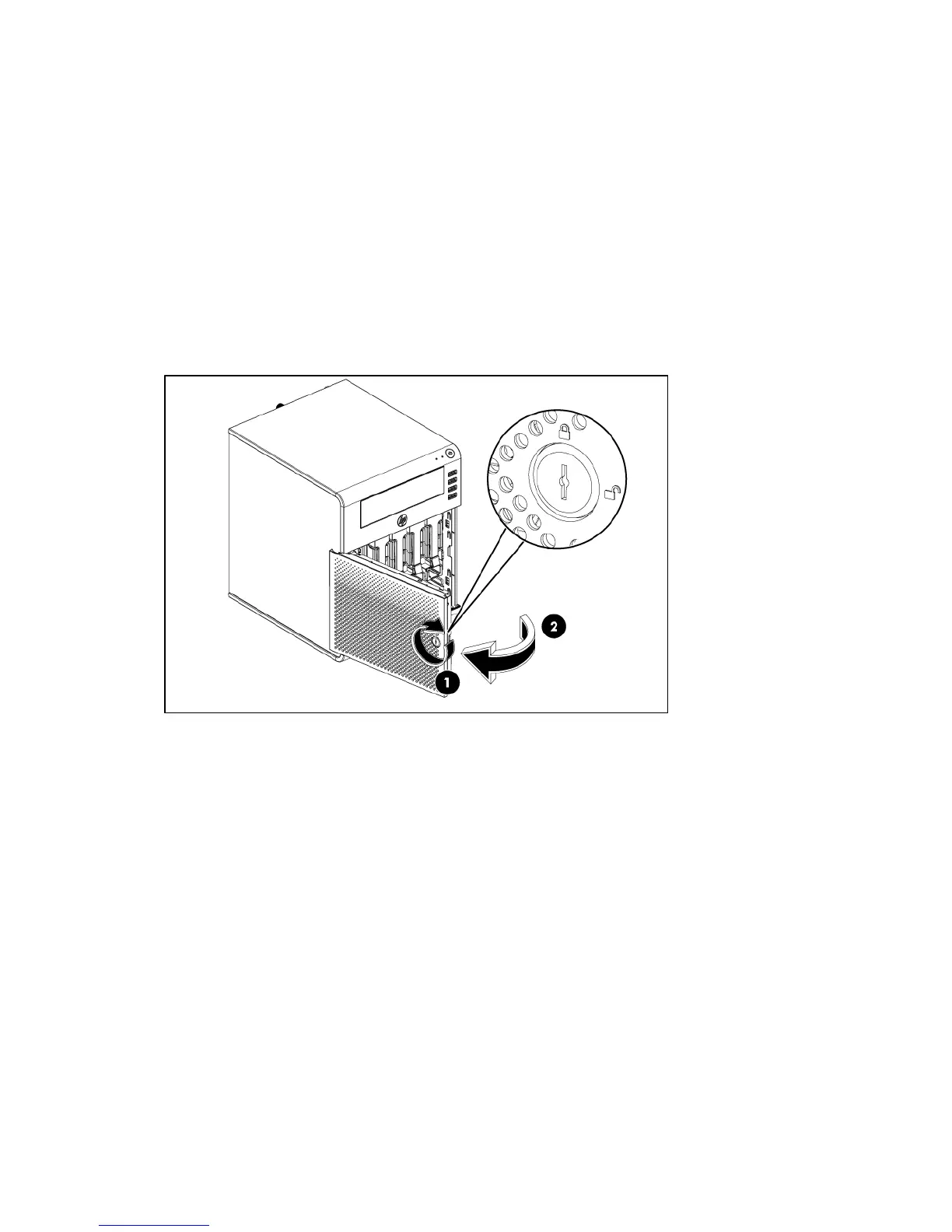 1. Using the HP ProLiant MicroServers key to unlock the panel door (1).