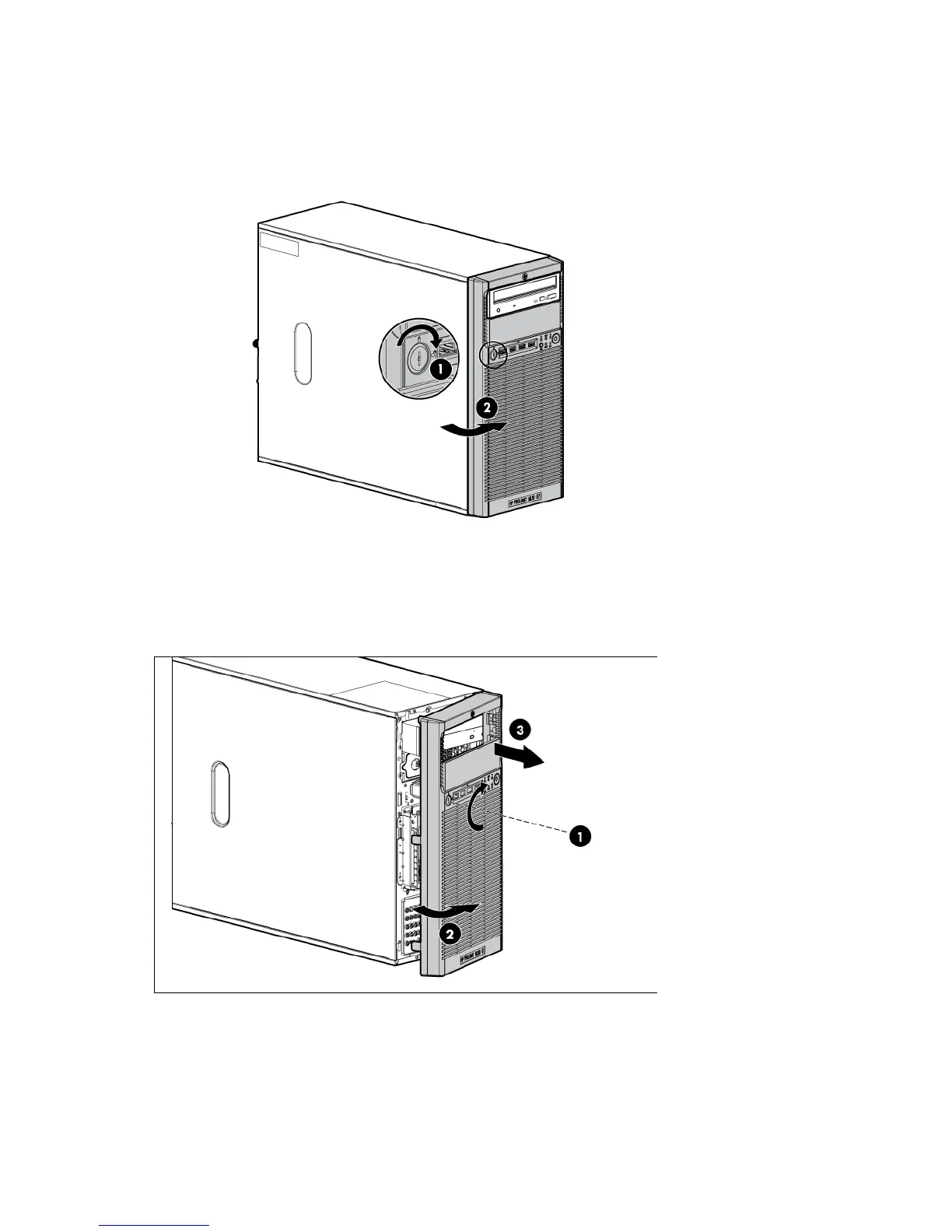 The tower bezel must be unlocked and opened to access the drive cage and media bays. It must be unlocked