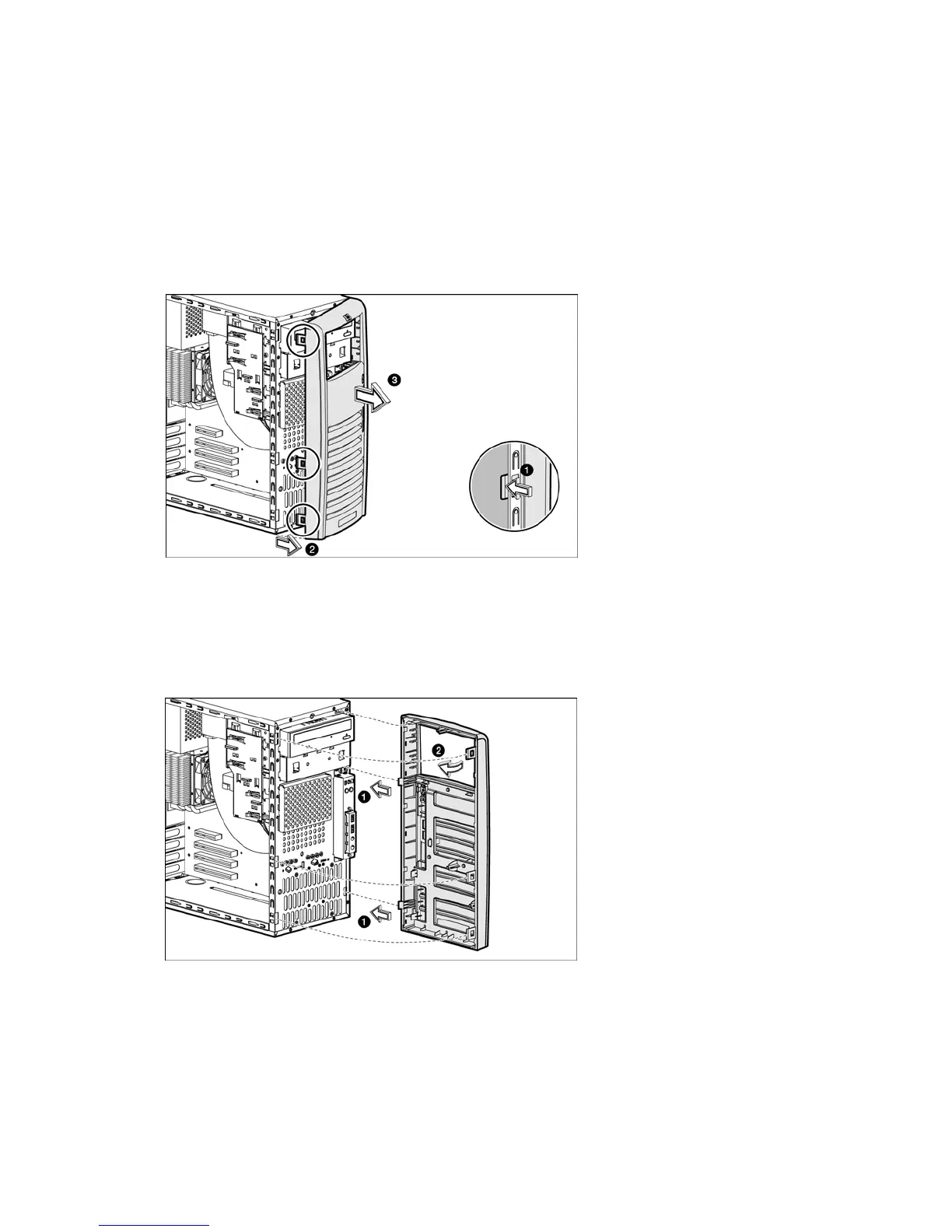 2. Insert the two hooks on the right side of the bezel into the rectangular holes on the chassis, and then rotate