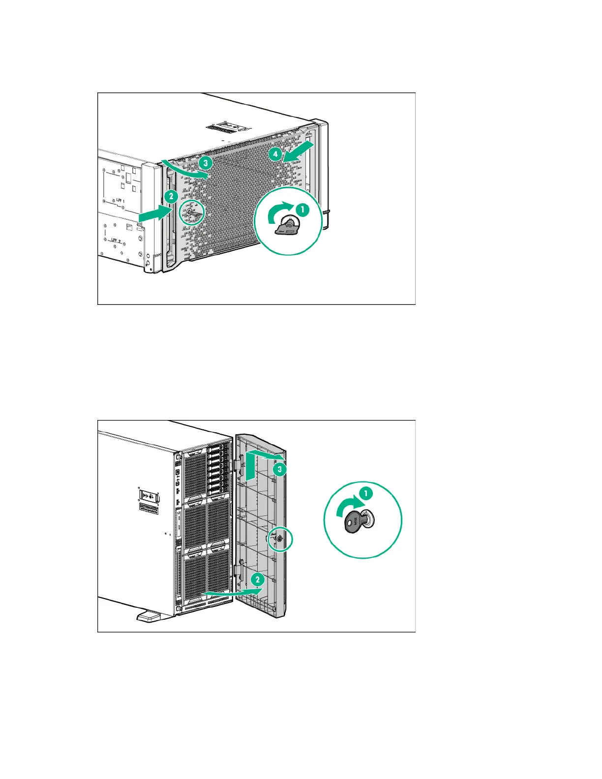 The tower configuration server has a removable bezel that must be unlocked and opened before