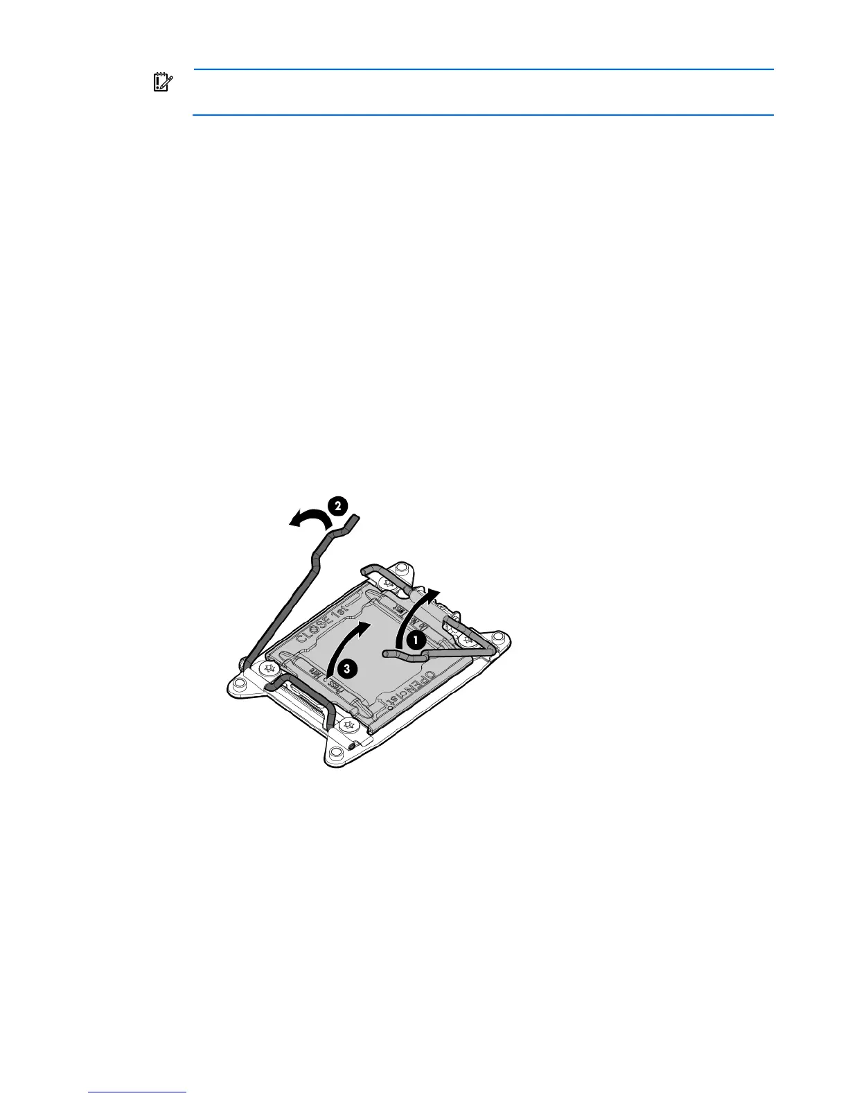 7. Open each of the processor locking levers in the order indicated, and then open the processor retaining