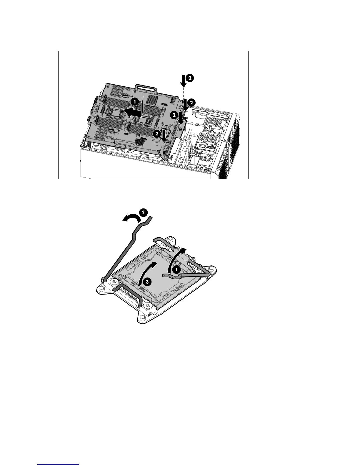 2. Open each of the processor locking levers in the order indicated, and then open the processor retaining