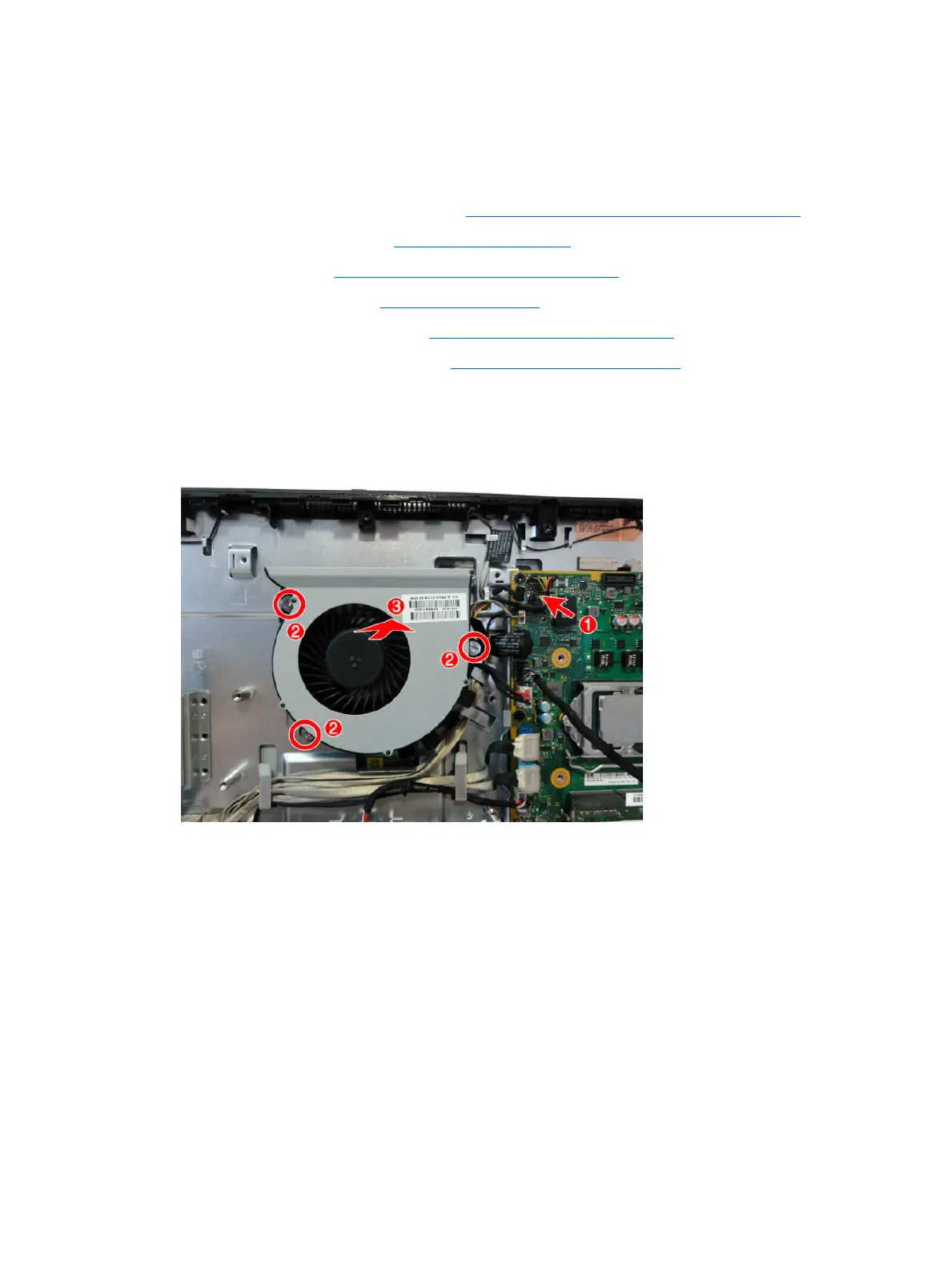 The fan assembly is located partially under the VESA mounting bracket and is secured with four Torx screws.