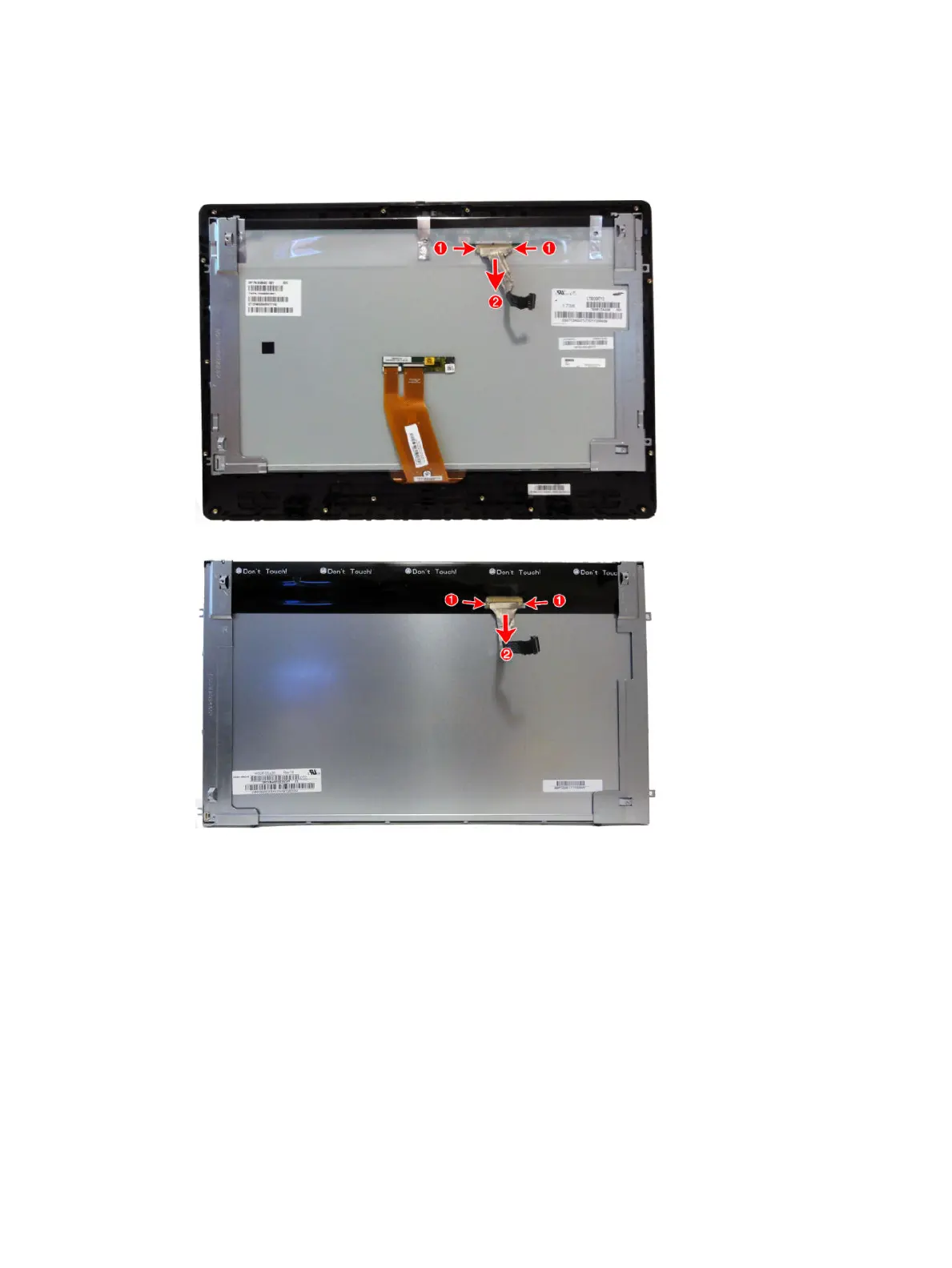 display panel by pressing on the latches on each side of the connector (1), and then pulling the cables