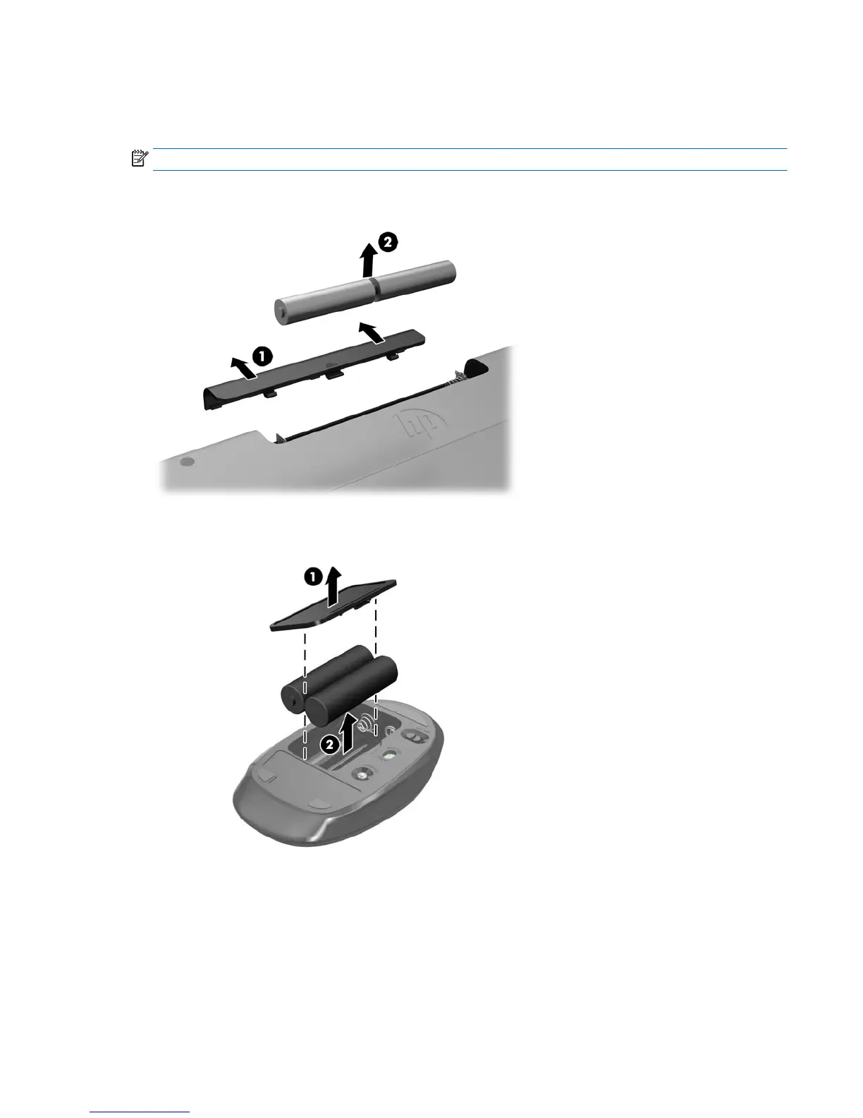 To remove batteries from the wireless mouse, remove the battery door on the underside of the mouse (1)