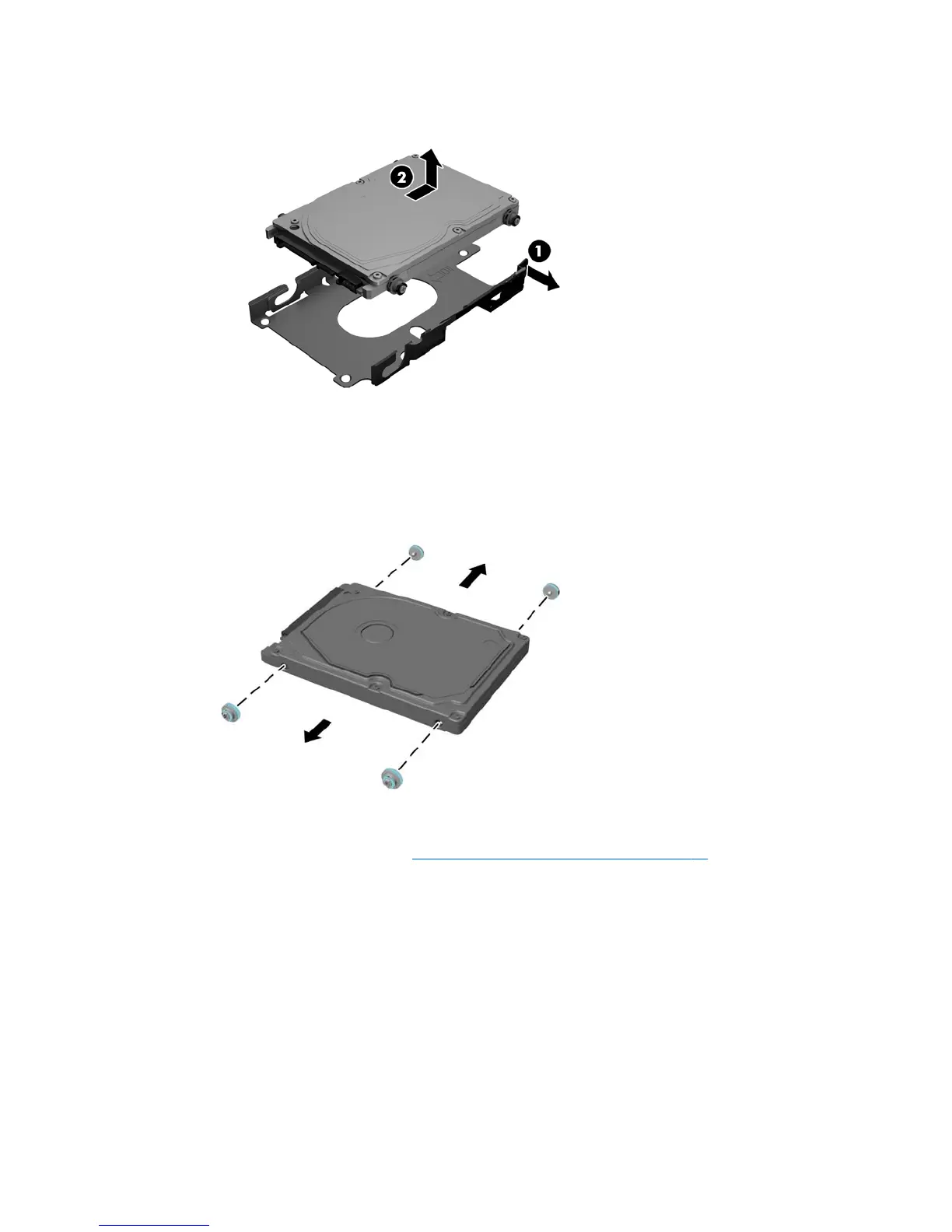 14. Slide the HDD toward the latch and lift the HDD out of the drive cage (2).