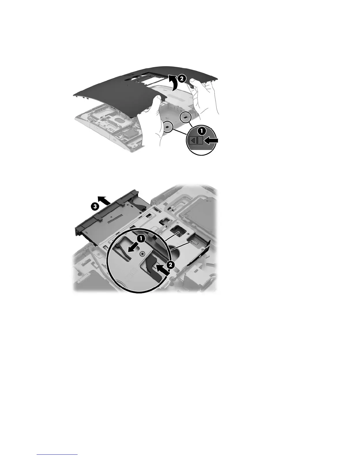 12. Push and hold the tab (1) while pushing in the latch (2) at the back of the ODD enclosure and slide the