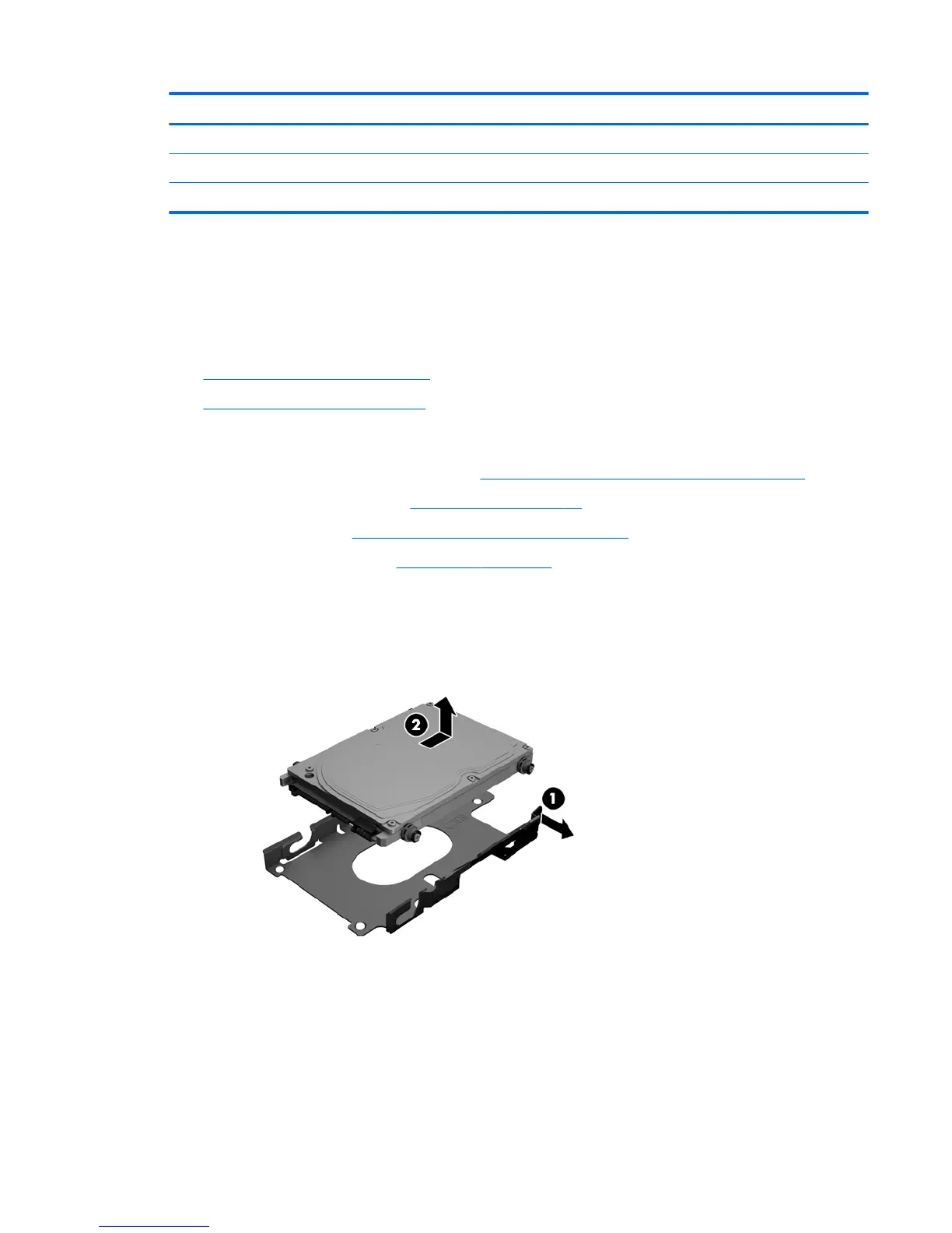 7. Slide the hard drive toward the latch and lift the hard drive out of the drive cage (2).